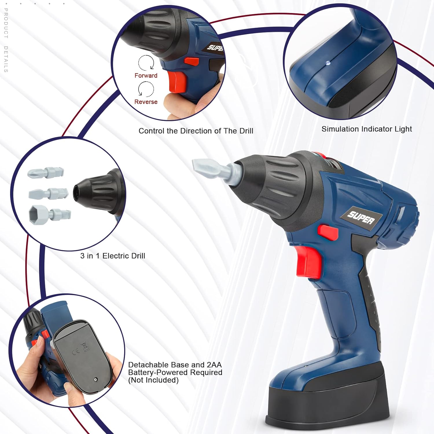 La perceuse à jouets électronique (nécessite 2 piles AA, non incluses) est conçue pour imiter le son, l’action et la lumière réels. Elle est également équipée de 3 forets interchangeables pour différentes fonctions. Cette perceuse rend l’apprentissage plus attrayant pour les enfants et les incite à découvrir et explorer le monde du bricolage.