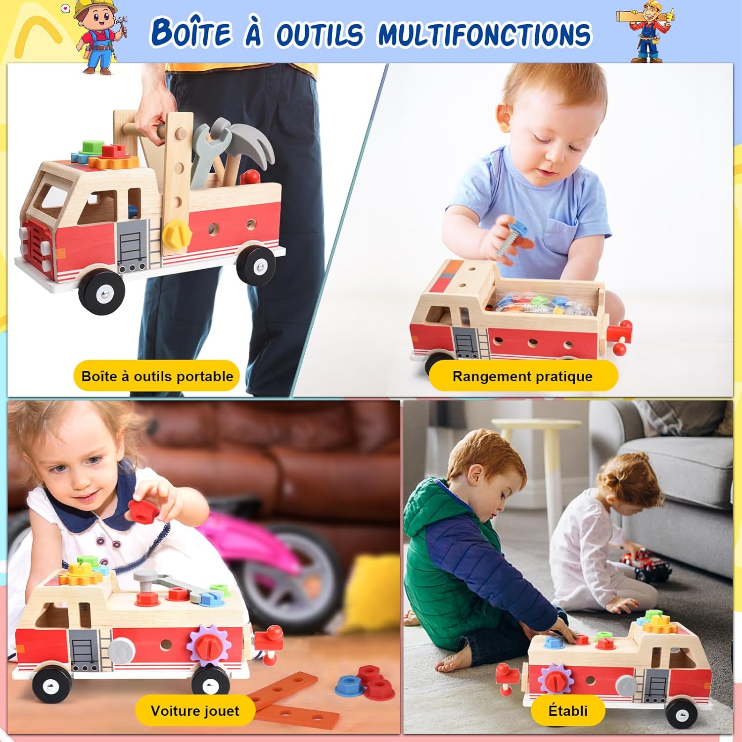 La boîte à outils est bien plus qu’un simple réceptacle. Elle se transforme en établi pour enfants, en camion jouet, en grue et même en sac de transport. Ce magnifique kit Montessori encourage non seulement l’apprentissage pratique mais aussi l’imagination et la créativité.