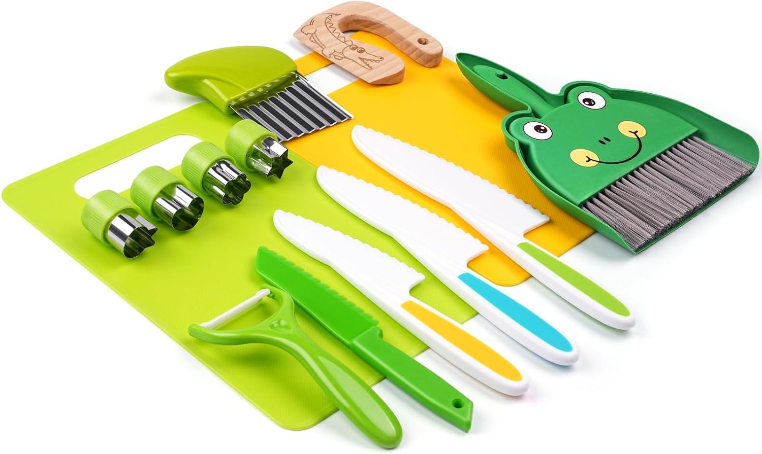L’ensemble se compose de divers ustensiles, soigneusement sélectionnés pour répondre aux besoins des jeunes cuisiniers. Avec un couteau en bois, quatre couteaux à bords dentelés pour tout-petits, deux planches à découper, un éplucheur en Y, quatre emporte-pièces à sandwich, un emporte-pièce froissé et un petit balai avec pelle à poussière, vos enfants auront tout le nécessaire pour explorer la cuisine en toute sécurité.