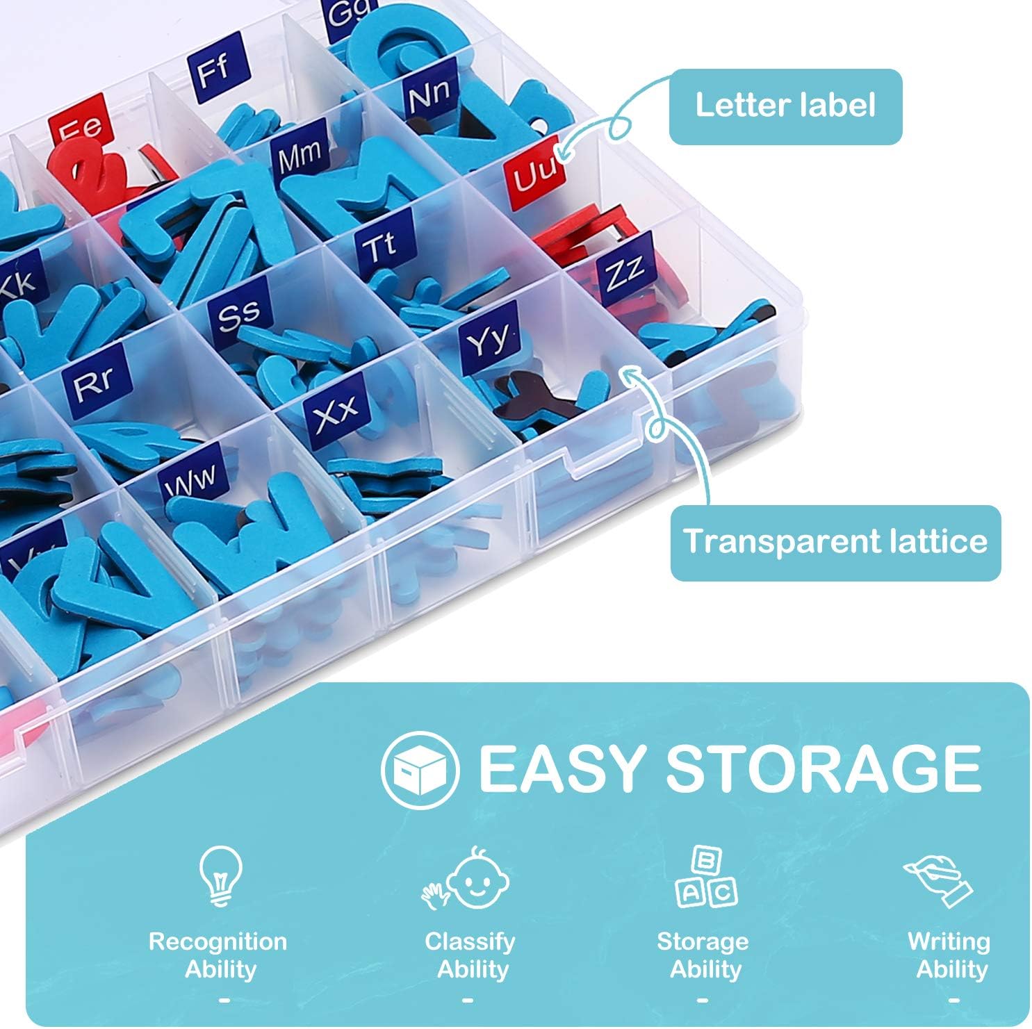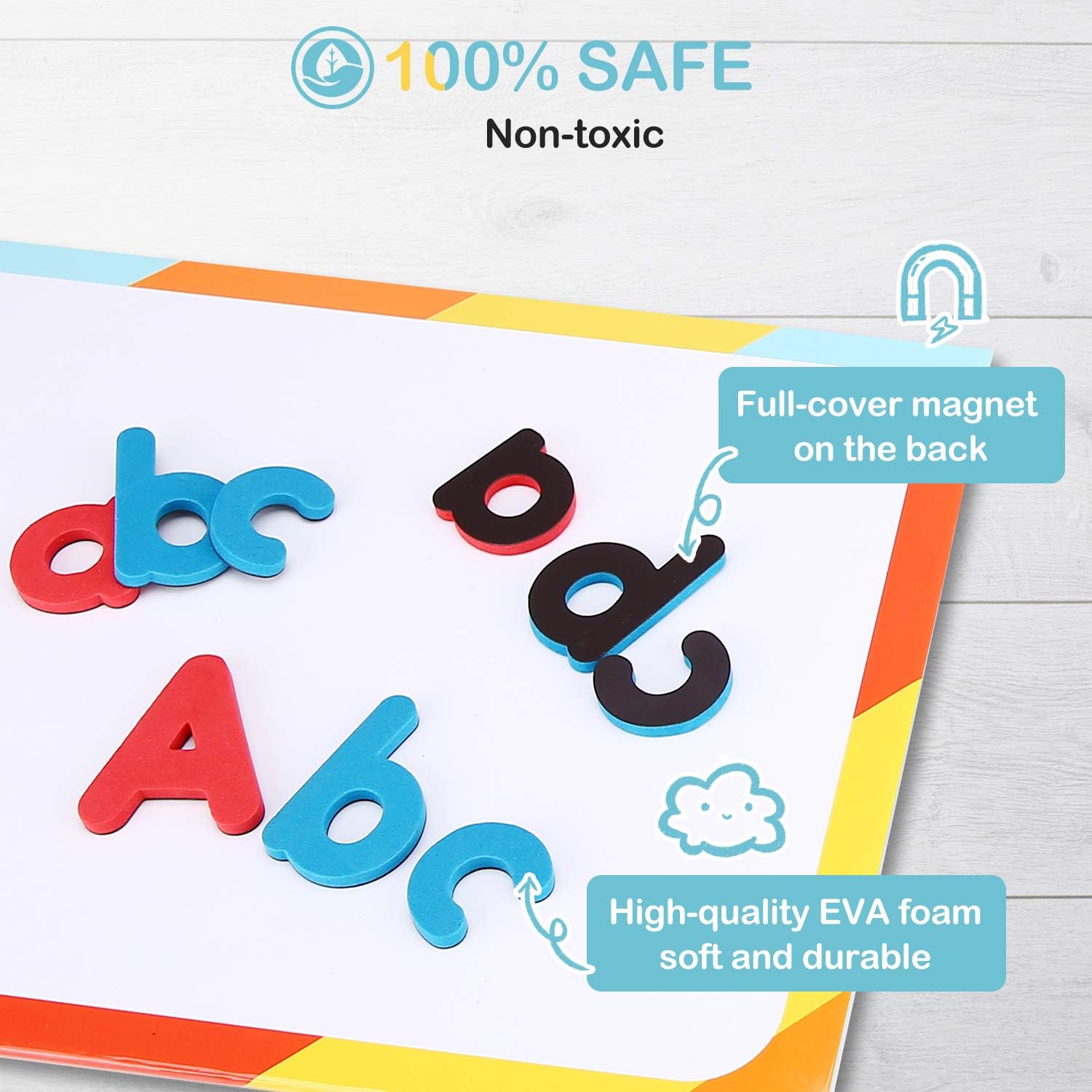 Ce kit comprend tout ce dont votre enfant a besoin pour découvrir les lettres et les chiffres. Il contient 52 lettres majuscules, 156 lettres minuscules, 20 chiffres et 10 symboles supplémentaires. Les deux tableaux de 30 x 20 cm permettent à votre enfant de jouer et d’apprendre en toute autonomie.