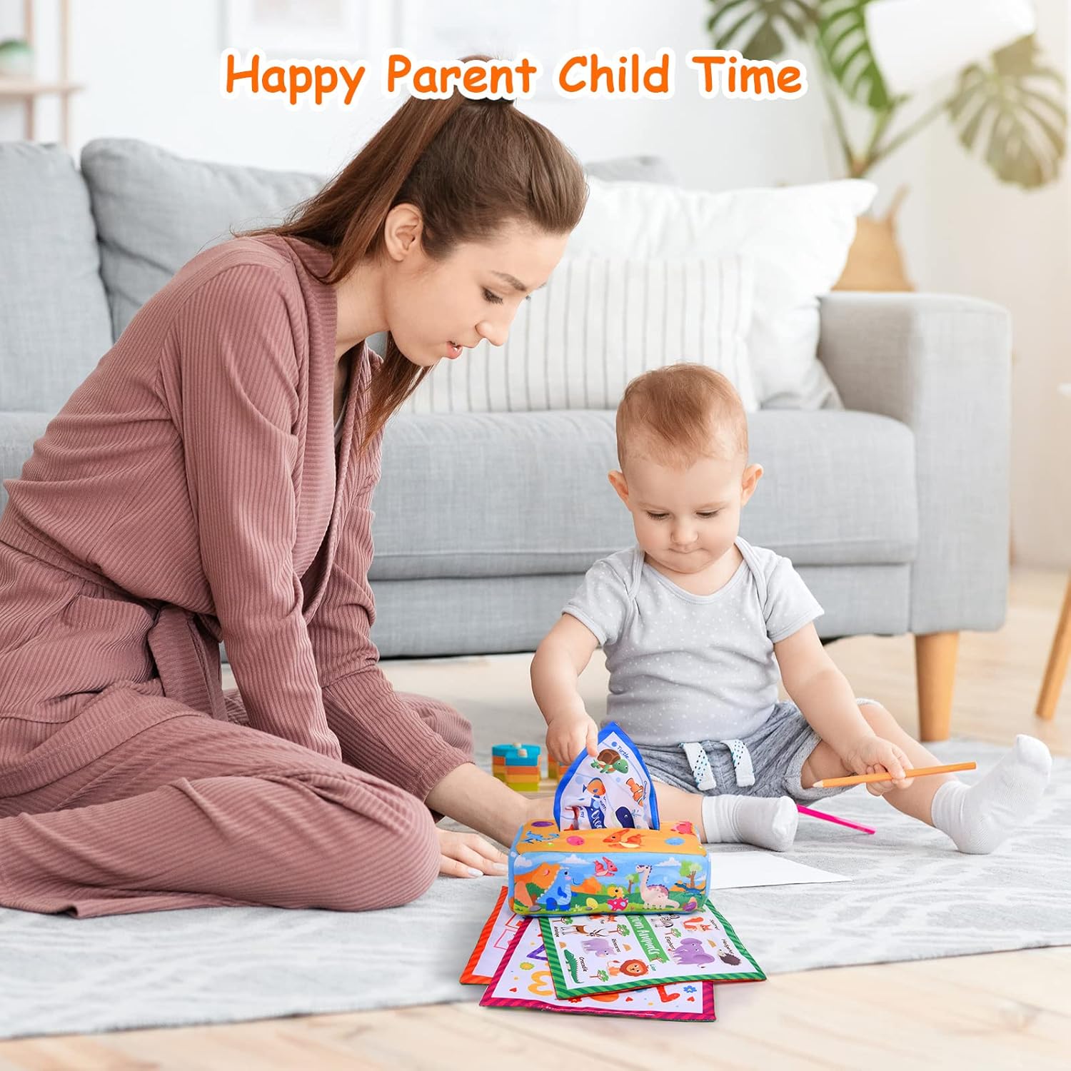 Livre en tissu sensoriel Montessori pour bébés avec boîte à mouchoirs et accessoires