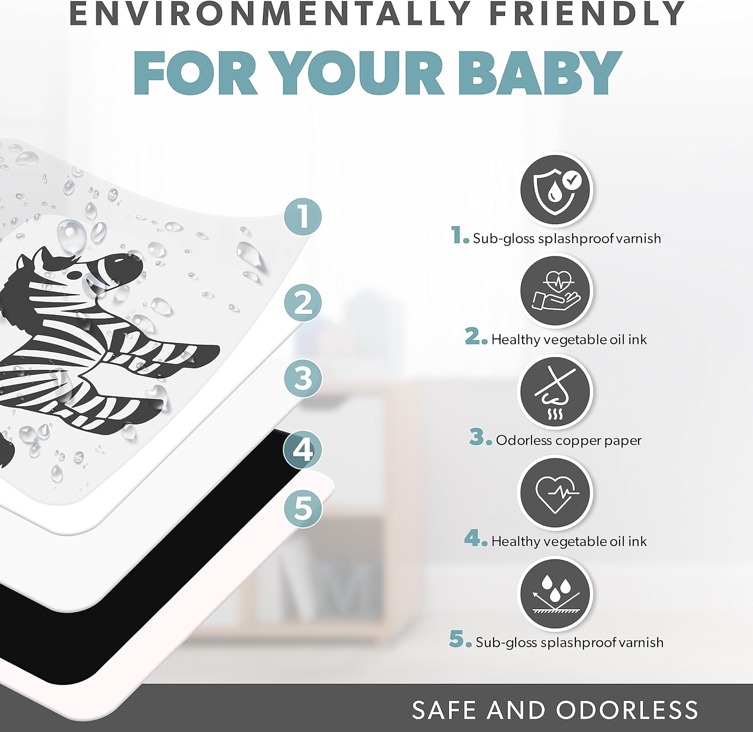 Nos cartes sensorielles noires et blanches pour bébé sont conçues pour résister aux rigueurs du jeu infantile. Elles sont fabriquées à partir de matériaux durables de haute qualité, assurant qu’elles sont exemptes de substances nocives. Chaque carte mesure 15 x 15 x 2 cm et pèse 260 grammes, ce qui les rend faciles à manipuler pour votre bébé.