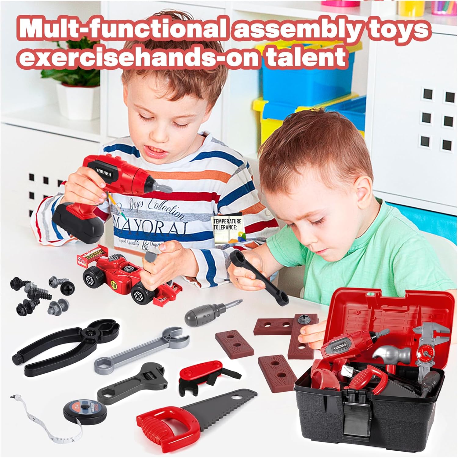 Sécurité et qualité sont au rendez-vous avec cette malette d’outils Montessori. Tous les accessoires sont fabriqués en plastique ABS durable et non toxique. Les bords lisses des outils garantissent la sécurité des enfants lorsqu’ils jouent. De plus, ces outils de jeu sont parfaitement dimensionnés pour les petites mains des enfants.