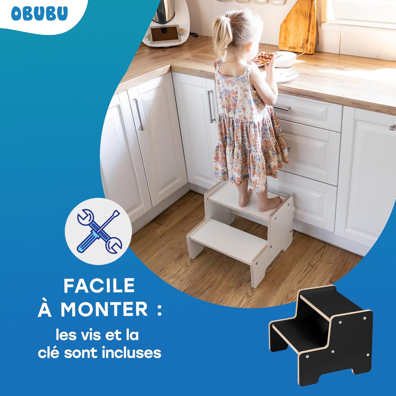 Le marchepied montessori est livré sous forme de kit à monter soi-même. Tous les éléments nécessaires au montage sont inclus : vis, boulons et une clé adaptée. En suivant les instructions claires fournies, vous pourrez assembler ce produit en un rien de temps, prêt à être utilisé immédiatement.