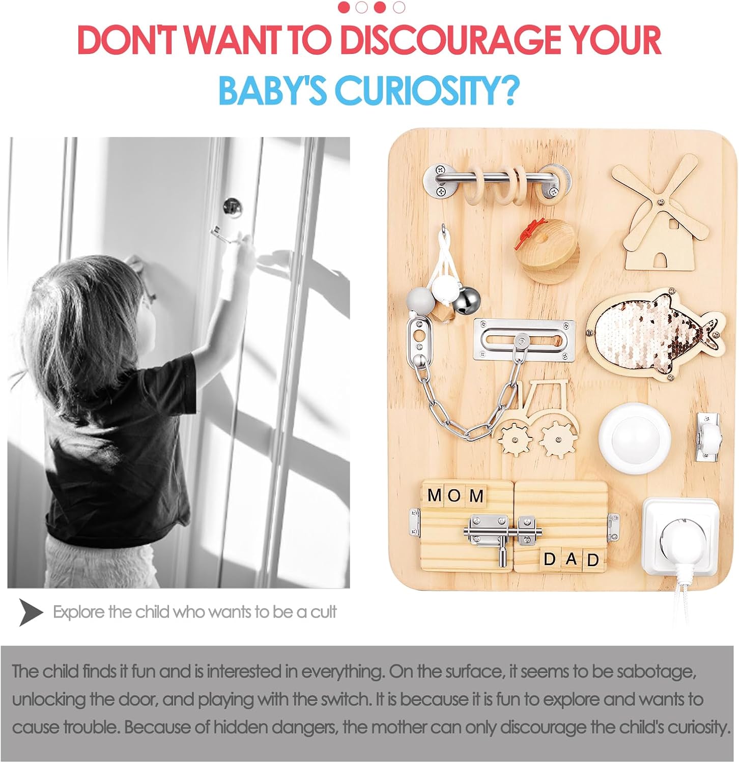 Offrez à votre enfant une alternative ludique et éducative aux écrans électroniques. Cette planche d’activité Montessori est un cadeau idéal qui permet aux enfants d’explorer librement, développant ainsi leur vision, leur audition et leur toucher.