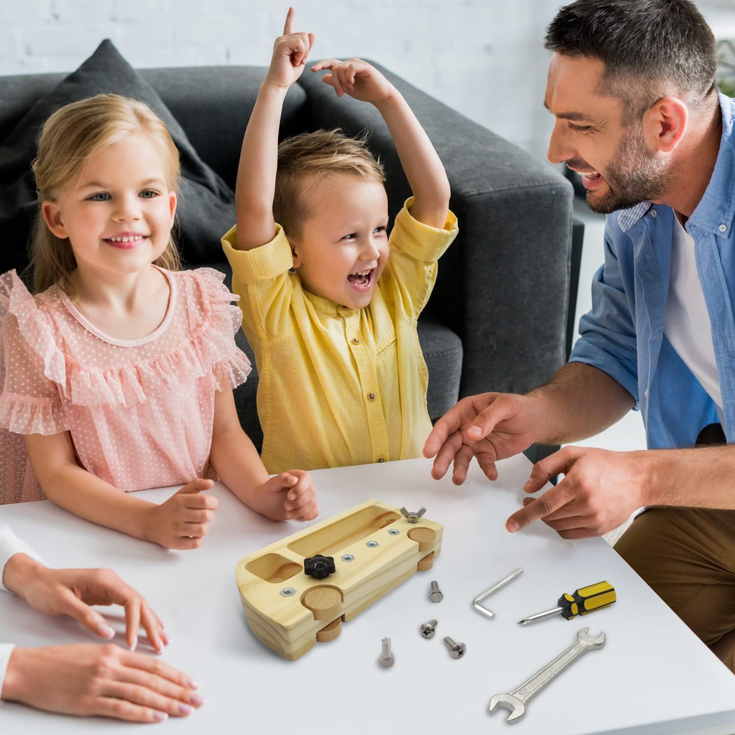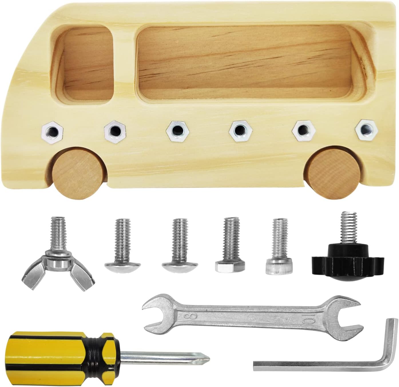 Avec cette planche d’activité, votre enfant pourra s’exercer à retirer et réinsérer six types de vis différentes à l’aide du tournevis, de la clé hexagonale et de la clé inclus. Ce processus permettra non seulement d’améliorer sa coordination œil-main, mais aussi sa reconnaissance et ses activités sensorielles. Qui sait ? Peut-être votre enfant deviendra-t-il un grand ingénieur dans le futur !