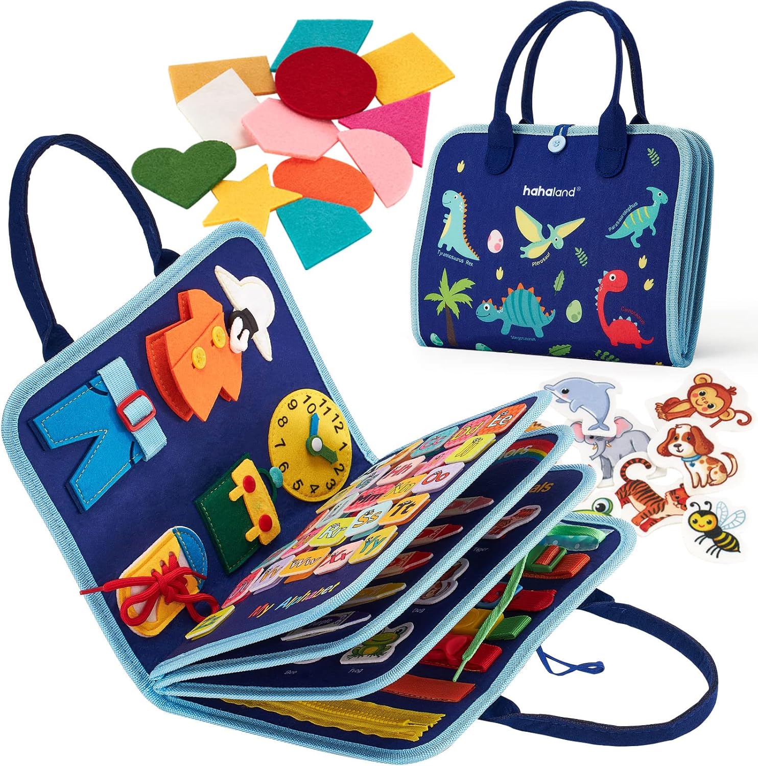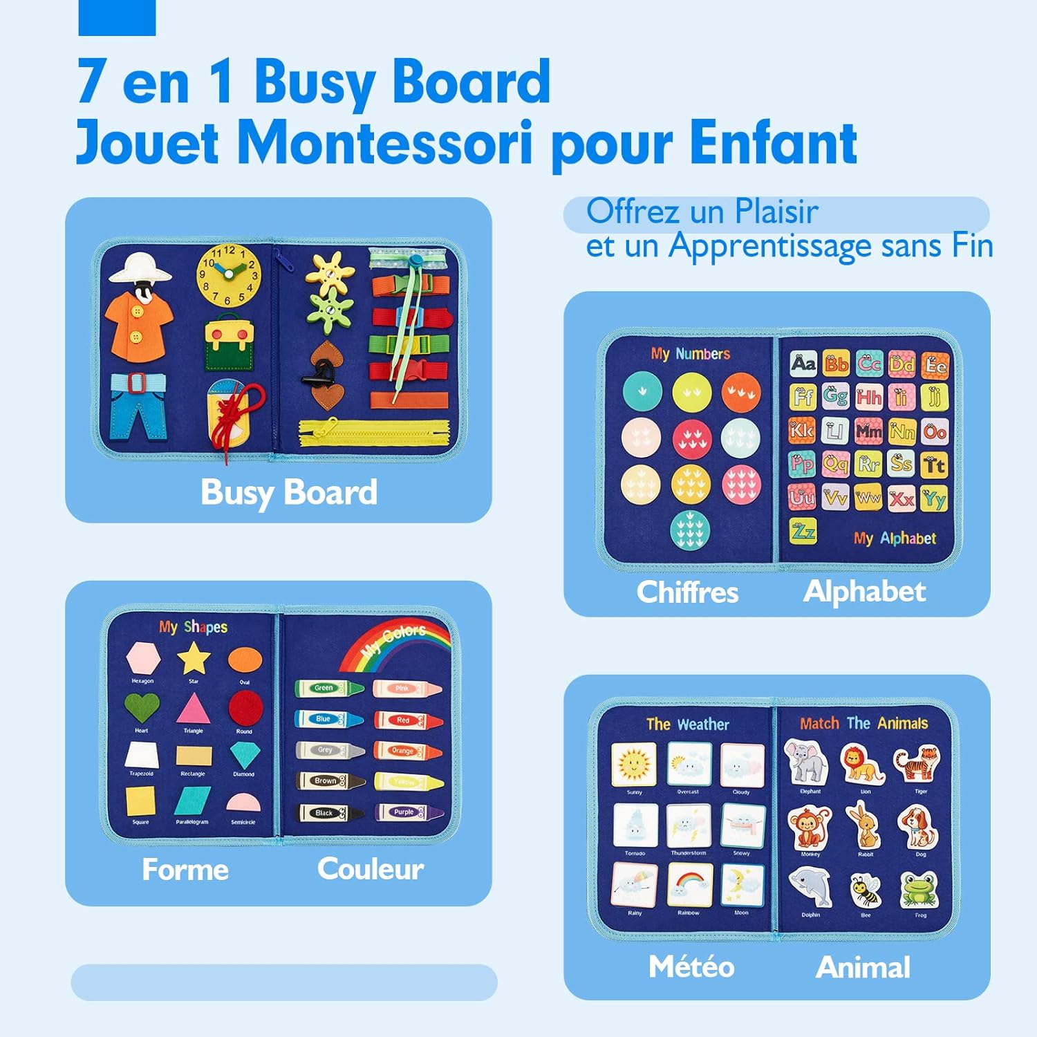 La Planche d’activité Montessori Hahaland est une véritable busy board 7-en-1. Elle rassemble l’alphabet, les chiffres, les formes, les couleurs et les animaux, le tout sur un tableau d’apprentissage météorologique. Chaque élément de ce plateau pédagogique offre aux enfants des occasions multiples de jouer et d’apprendre.