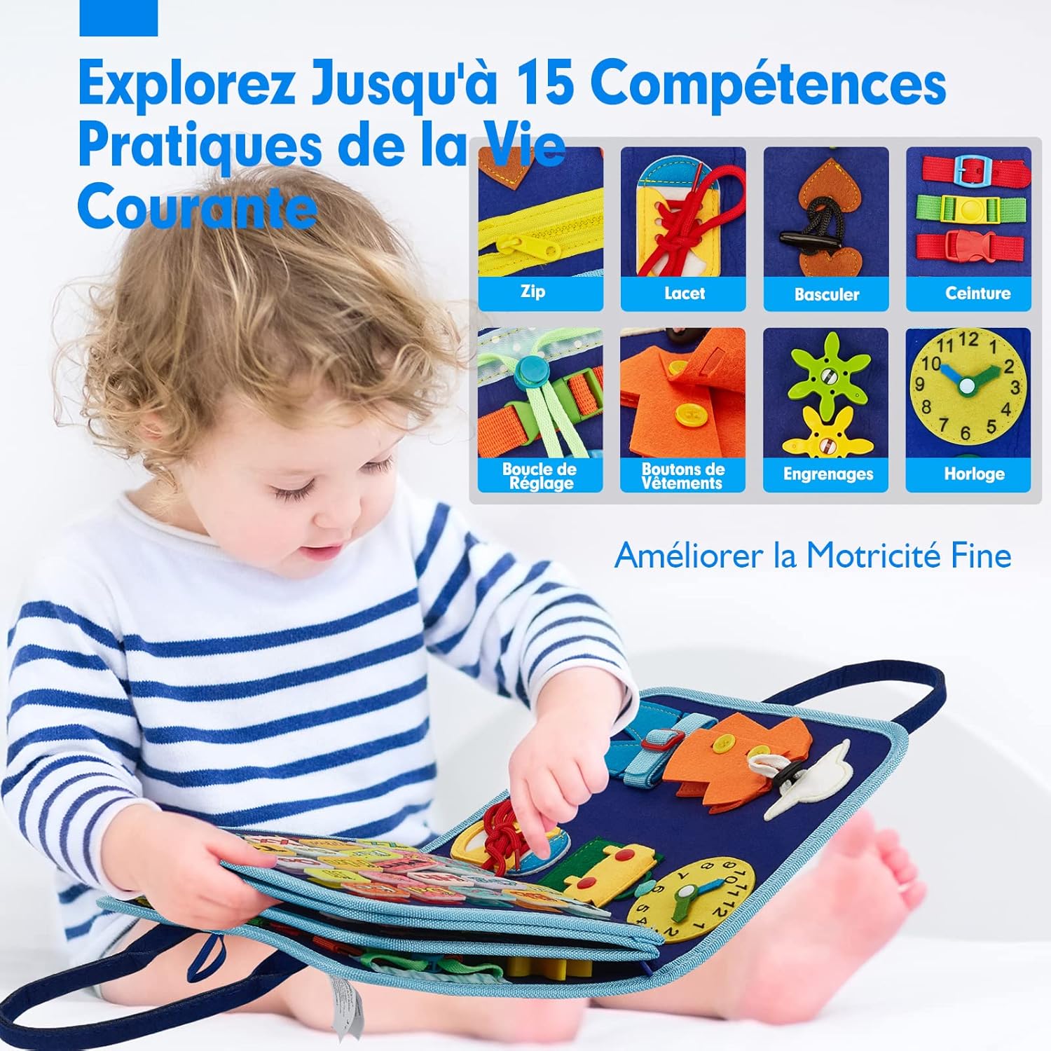 Grâce à sa fermeture éclair amovible, cette planche Montessori permet aux enfants de se concentrer sur une activité à la fois. Avec 15 activités sensorielles, elle aide les enfants à développer leurs habiletés pratiques telles que l’habillage, le bouclage, le boutonnage et l’attachement. Ces compétences sont essentielles pour le développement de la motricité fine, la pensée logique et la coordination œil-main.