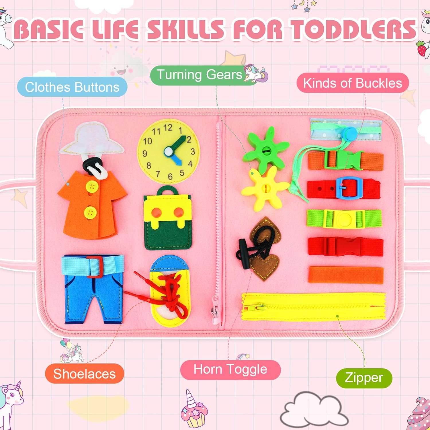 En plus d’être une source d’amusement, cette planche d’activité permet également de développer les compétences de base de la vie des tout-petits. Elle propose des activités telles que s’habiller, boutonner, attacher les lacets et fermer la fermeture éclair. De plus, elle stimule l’apprentissage des chiffres, des couleurs, de l’alphabet ainsi que la compréhension du temps grâce à l’horloge et la date. En jouant avec cette planche, votre enfant développe sa coordination main-œil et ses capacités cognitives, stimulant ainsi le développement de son cerveau.