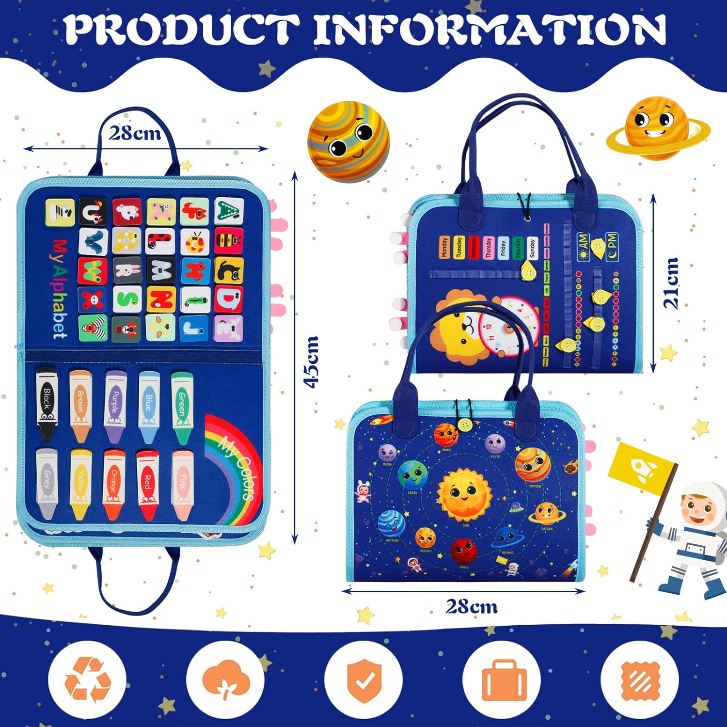 Avec cette busy board, votre enfant aura l’opportunité d’apprendre tout en s’amusant. Proposant 10 pages et couvrant 8 sujets majeurs : compétences de vie, apprentissage des lettres, chiffres, couleurs, temps, correspondance des formes, rencontre avec les animaux et puzzles spatiaux, elle offre une multitude d’activités pour maintenir l’intérêt de l’enfant éveillé.