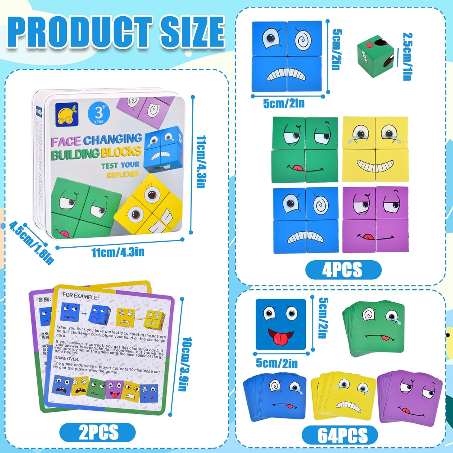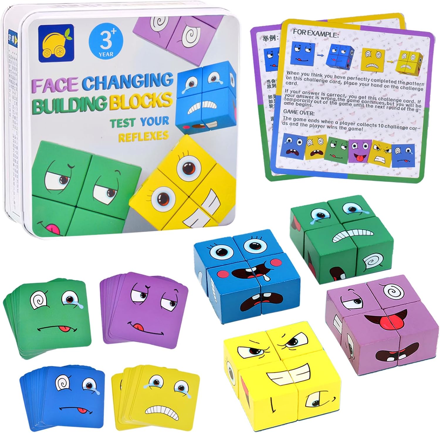 Ce puzzle, d’un poids léger de 280 grammes, présente des dimensions de 5 x 5 x 5 cm. Il est composé de 16 blocs de bois à expression et de 64 pièces de cartes à facettes. Ces éléments sont fabriqués à partir de bois, une matière douce et non toxique pour assurer une utilisation sécurisée. À noter que ce jeu ne nécessite pas de montage et ne requiert aucune batterie ou pile.