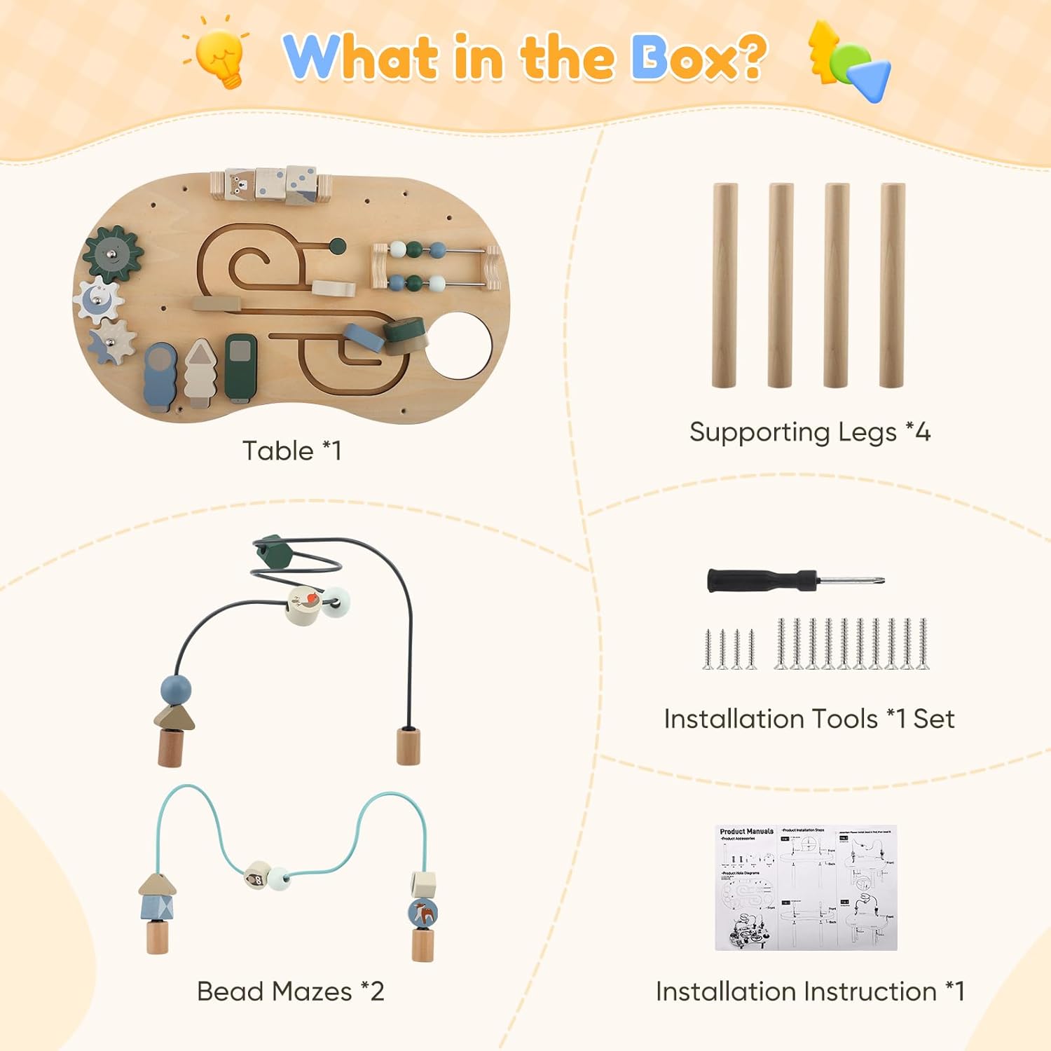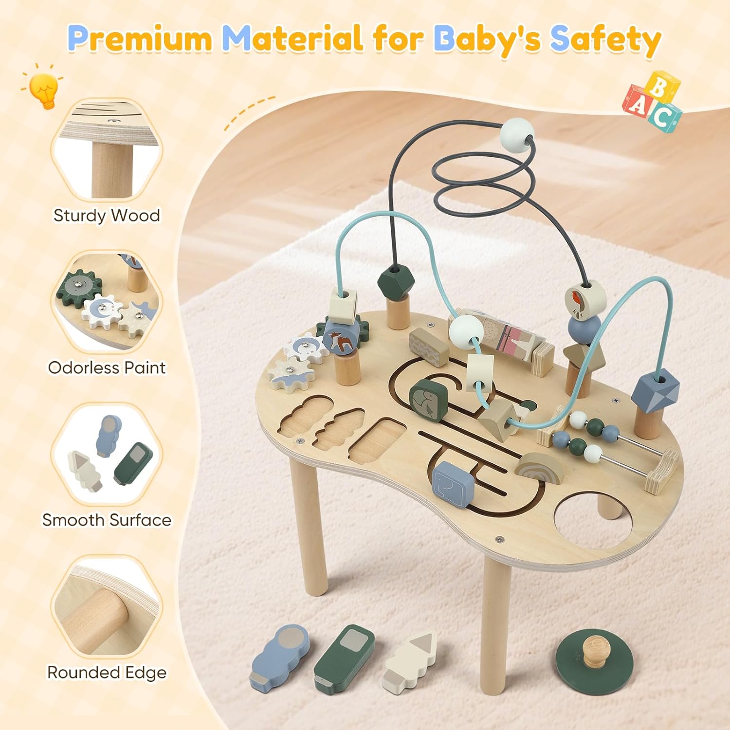 La sécurité et la qualité sont au cœur de cette table d’activités. Fabriquée à partir de bois robuste, elle présente des bords arrondis et des surfaces parfaitement lisses pour protéger les petites mains. La peinture utilisée est inodore, non toxique et conçue pour durer sans s’écailler, même après plusieurs nettoyages. Les pieds stables de la table garantissent une utilisation sans basculement, offrant ainsi une expérience de jeu totalement sécurisée.