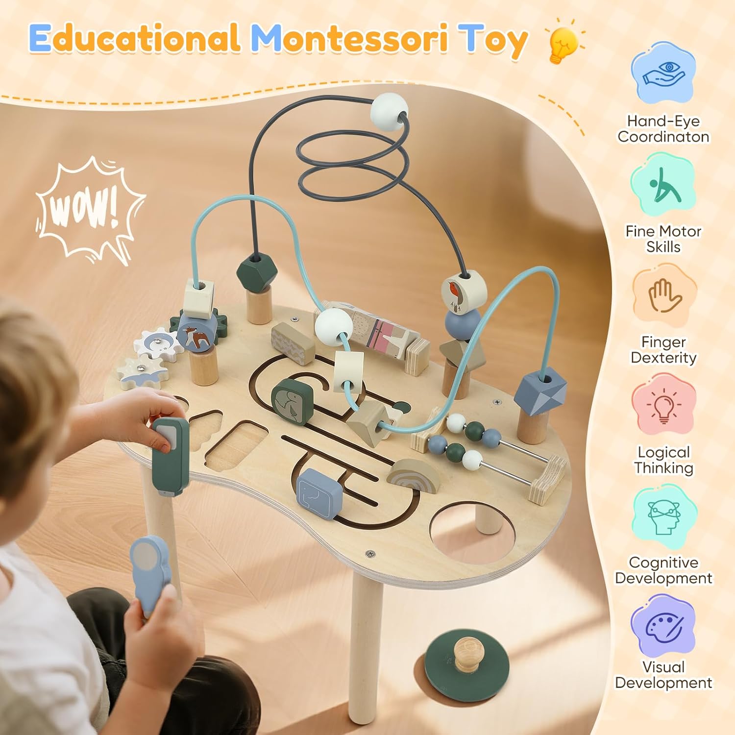 Plongez dans l’univers ludique et éducatif de la table d’activités en bois Montessori 7 en 1. Conçue pour les enfants dès 3 ans, cette table ingénieuse offre une multitude de jeux variés qui éveilleront leur curiosité tout en favorisant leur développement cognitif et moteur. Chaque activité a été soigneusement pensée pour accompagner les tout-petits dans leur apprentissage de manière amusante et interactive.
