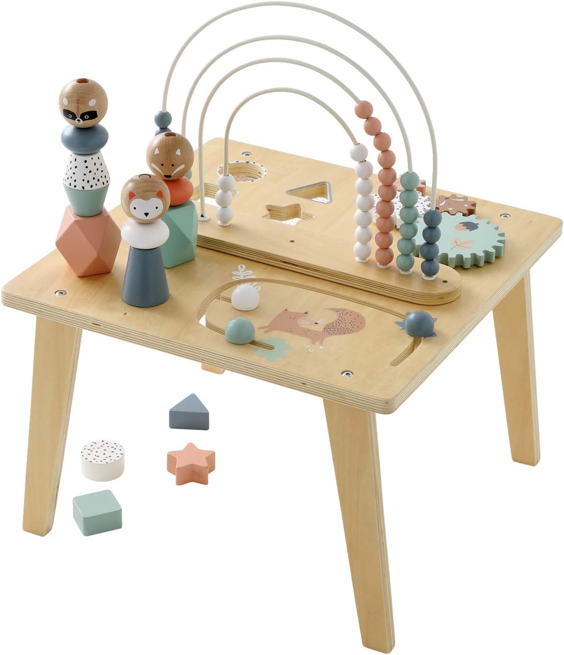 Au centre de la table trône un boulier coloré qui initie l’enfant aux premiers concepts mathématiques. Le jeu des engrenages sollicite quant à lui la logique et la coordination. Les formes à encastrer contribuent au développement de la motricité fine, tandis que les animaux à empiler encouragent l’imagination et la créativité. Enfin, le chemin de perles à faire glisser offre une activité apaisante et méditative.