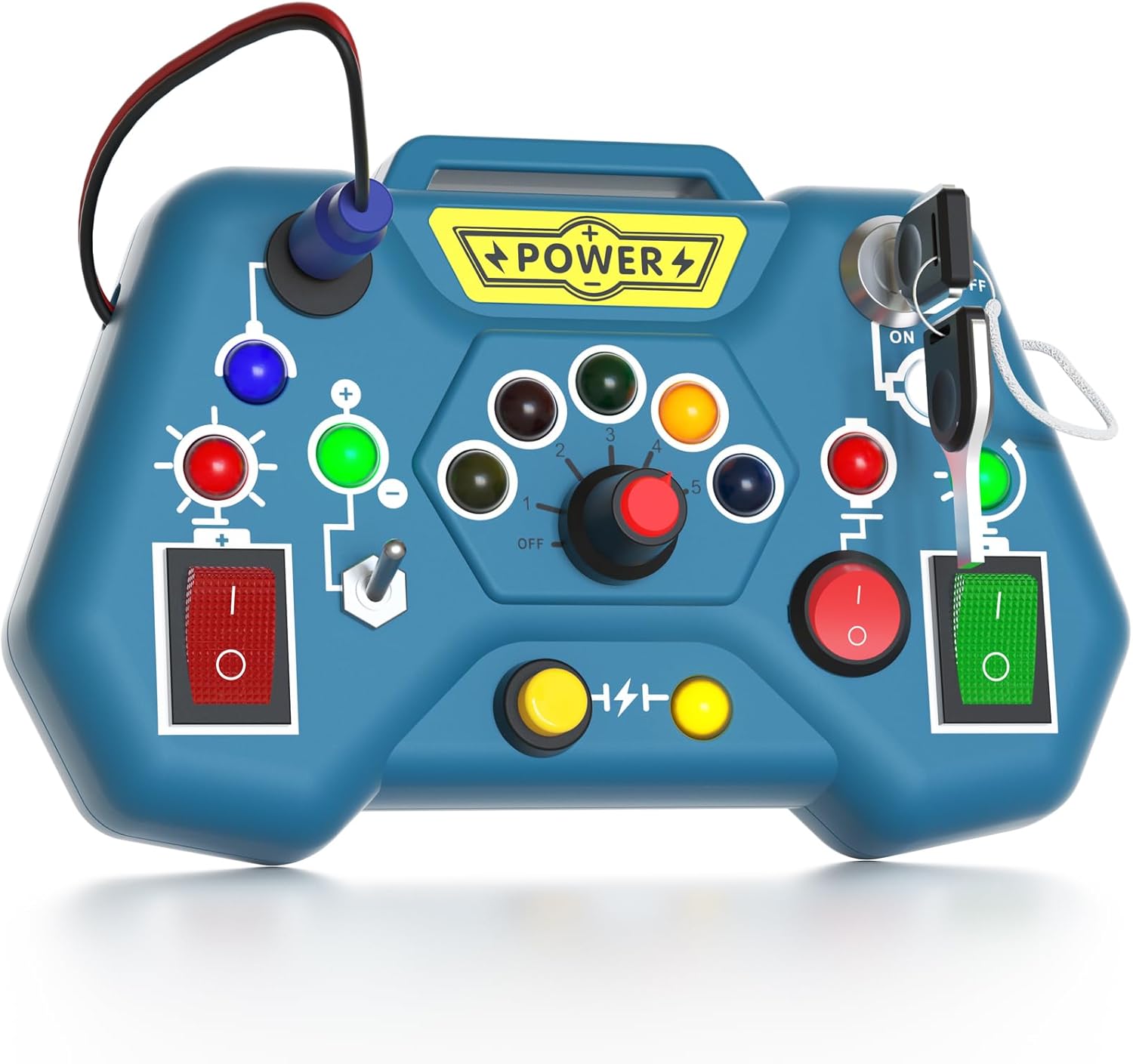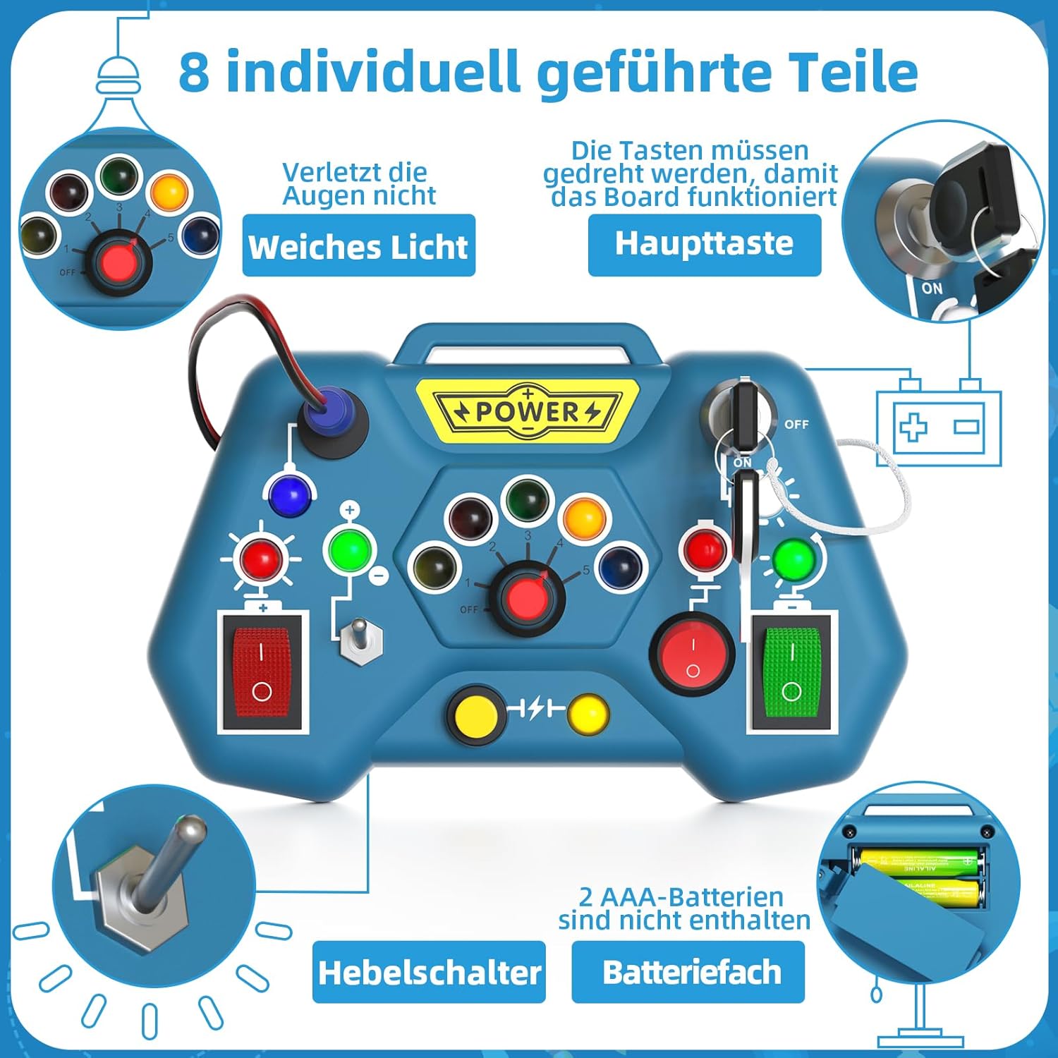 Ce tableau propose six types différents d’interrupteurs. Votre enfant peut tourner une clé, insérer un fil, appuyer sur un bouton ou encore pousser un levier. Chaque action contribue à améliorer la coordination œil-main, une compétence essentielle dans le développement de l’enfant.