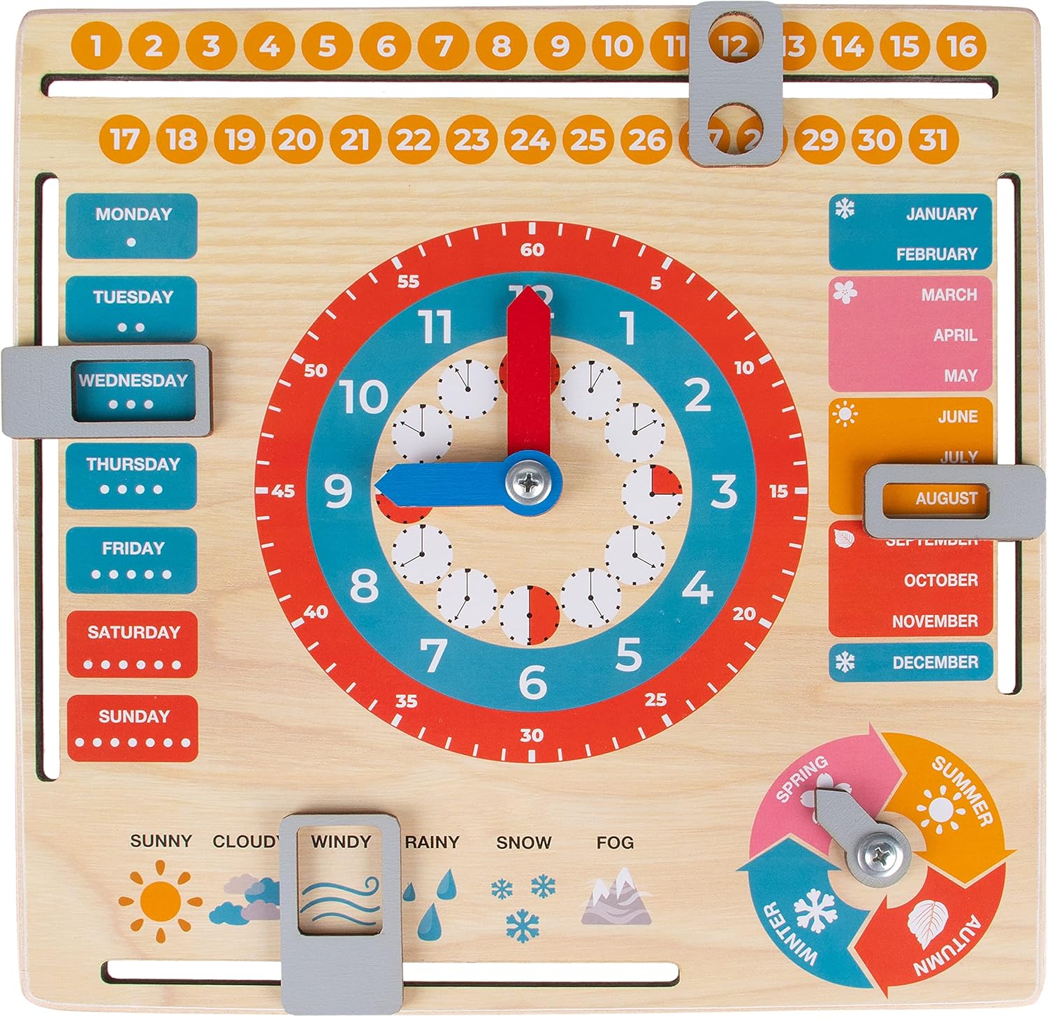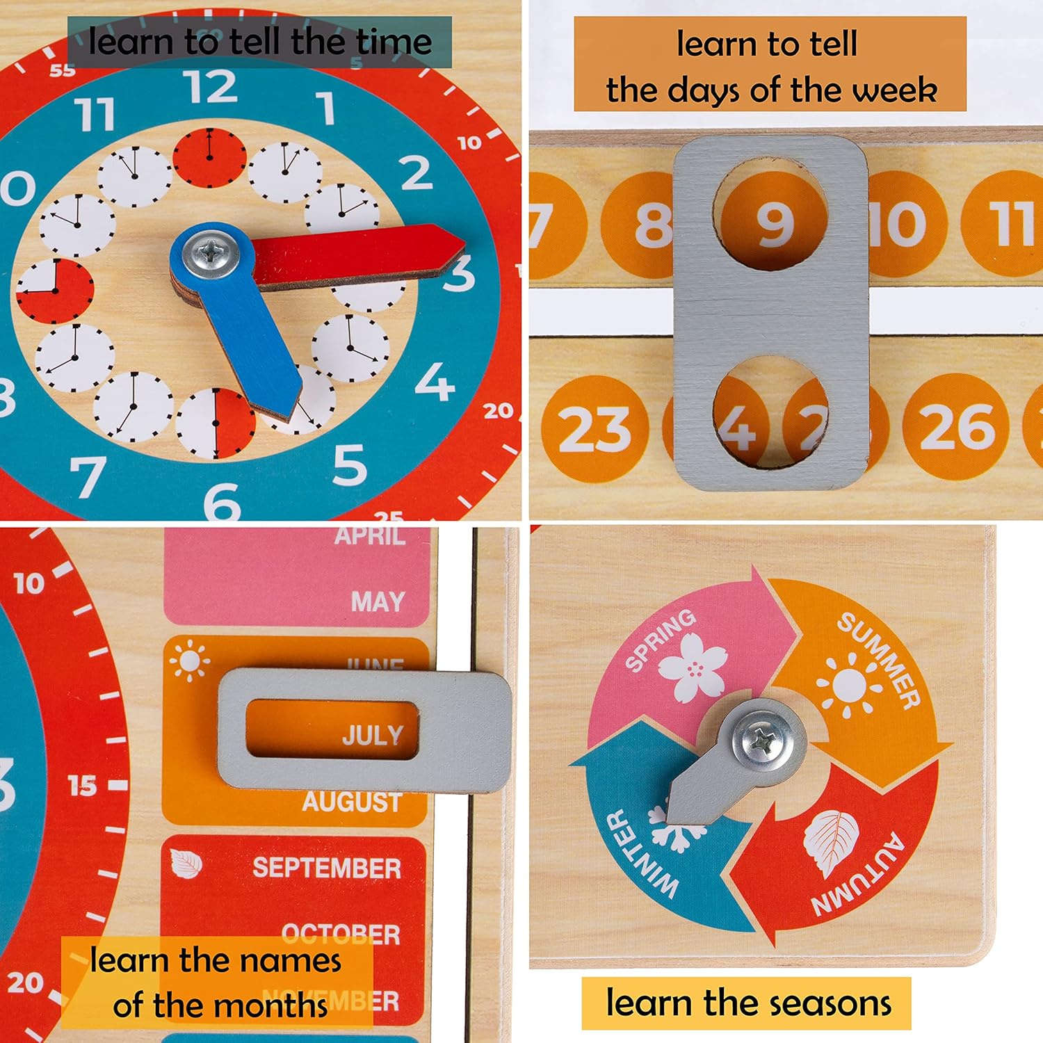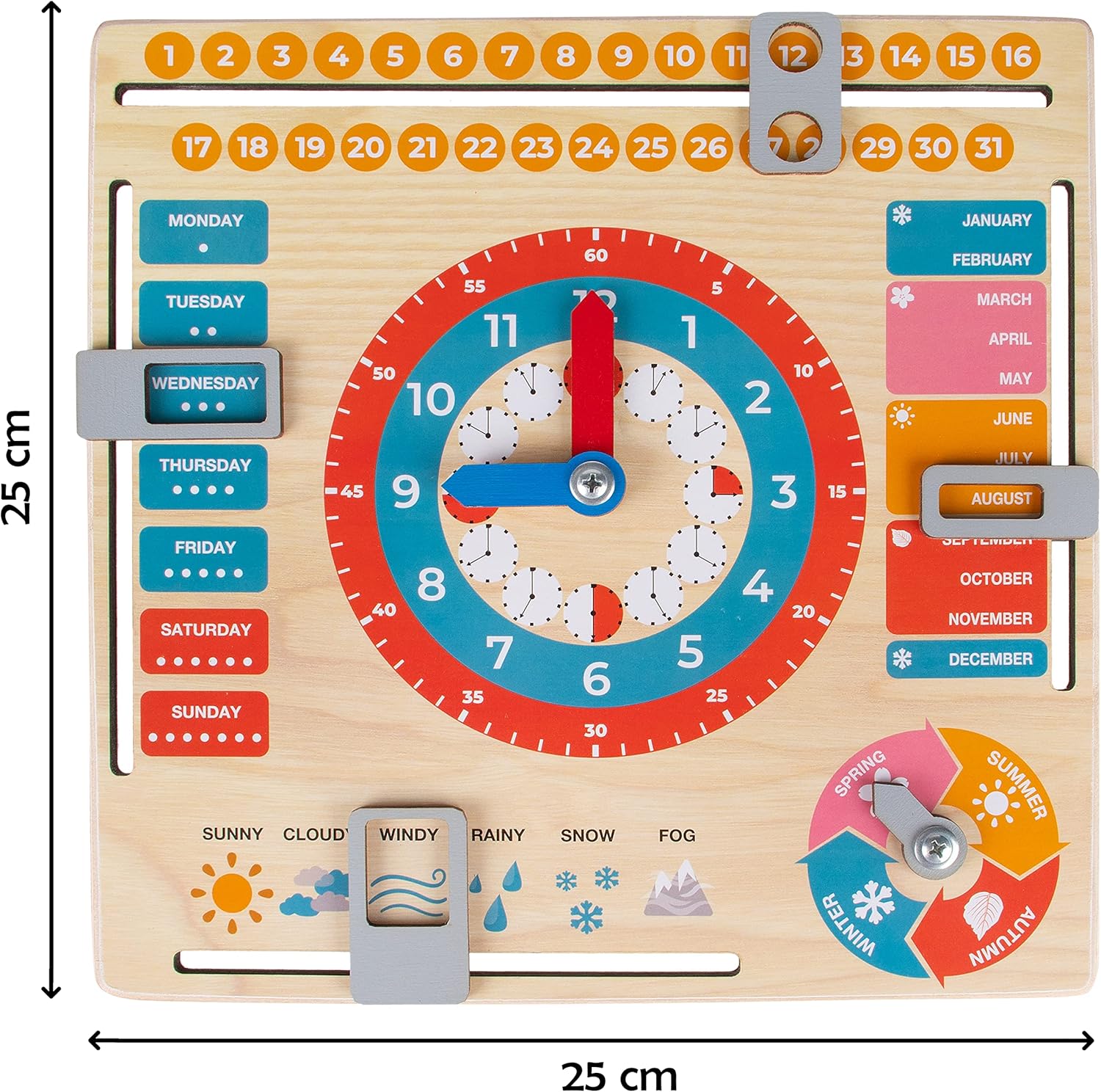 Ce tableau d’apprentissage offre une initiation complète à la langue anglaise grâce à ses multiples fonctionnalités. Il comprend un calendrier horloge pour apprendre les jours, les mois et les saisons, ainsi que le temps en anglais. De plus, son côté ludique permet de développer les capacités sensorielles des enfants tout en leur offrant une première immersion dans la langue de Shakespeare.