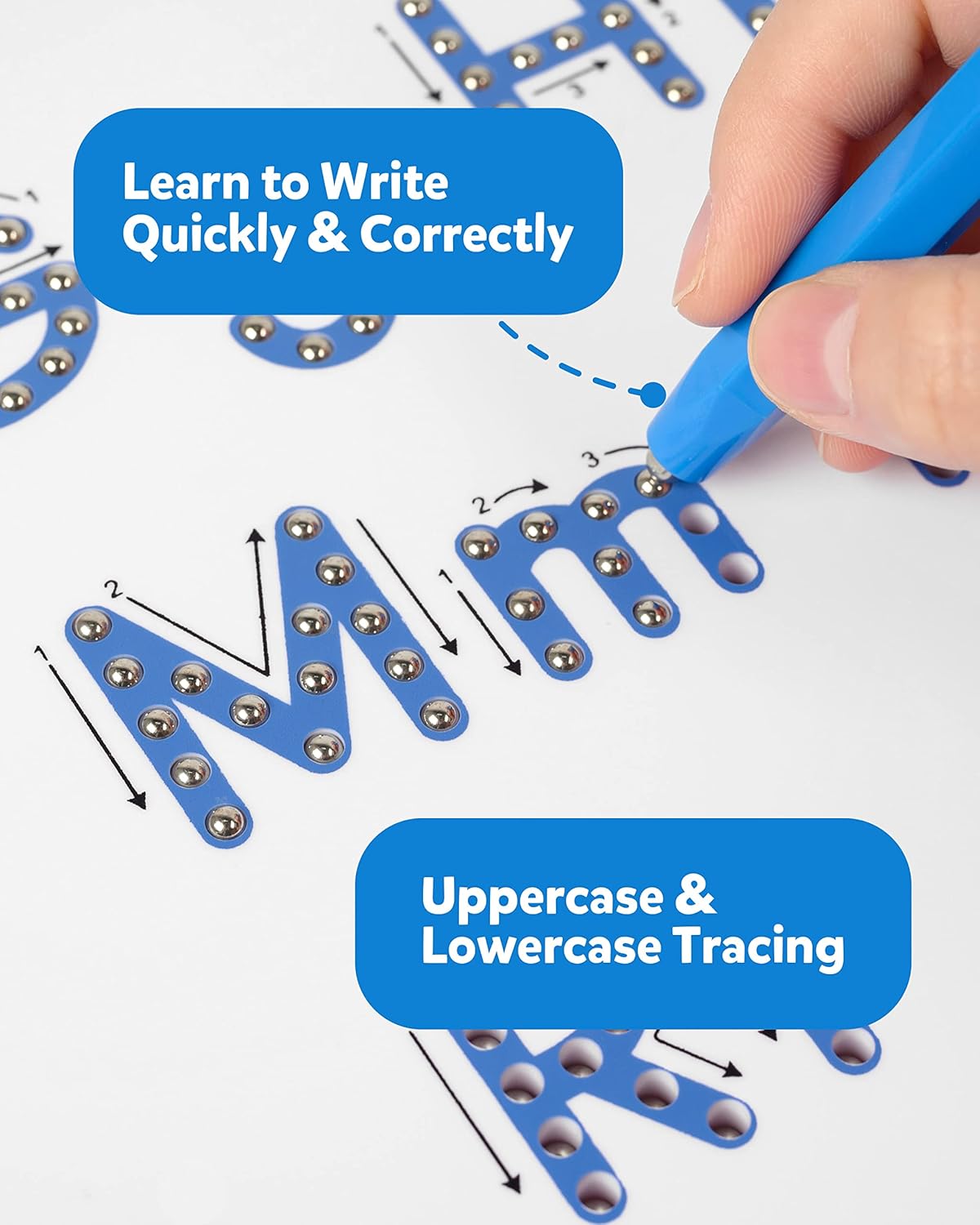 La pratique régulière avec ce tableau magnétique Montessori permet de développer la dextérité motrice des enfants. Chaque lettre a des traits numérotés et des flèches indiquant le sens du tracé. Cela aide grandement l’enfant à connaître la séquence d’écriture de chaque lettre. De plus, le tableau d’écriture magnétique peut effectuer des tracés sans fin en essuyant simplement les perles avec un stylo ou une main.