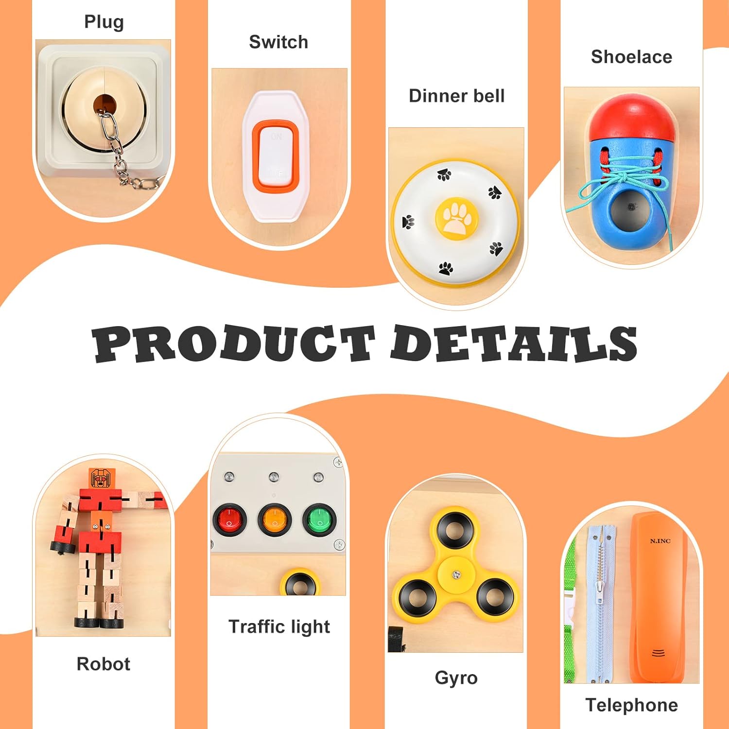 Ce tableau sensoriel propose une large gamme d’activités interactives, dont :