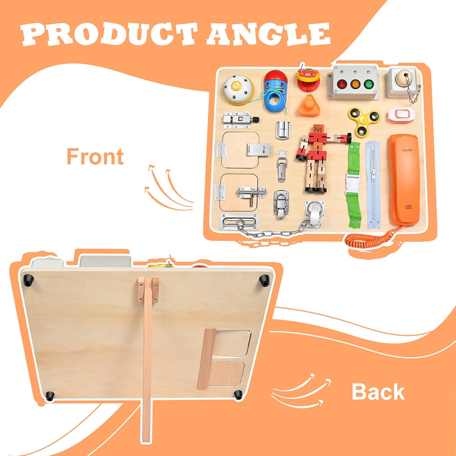Fabriqué à partir de bois de basse qualité supérieure et peint avec une peinture non toxique à base d’eau, ce tableau sensoriel garantit un usage sûr pour votre bébé. Sa surface lisse et ses bords arrondis assurent une manipulation sans risque, tandis que les charnières métalliques robustes résistent à l’usure et ne rouillent pas facilement. Ce jouet est conçu pour durer, tout en respectant les normes de sécurité les plus strictes.