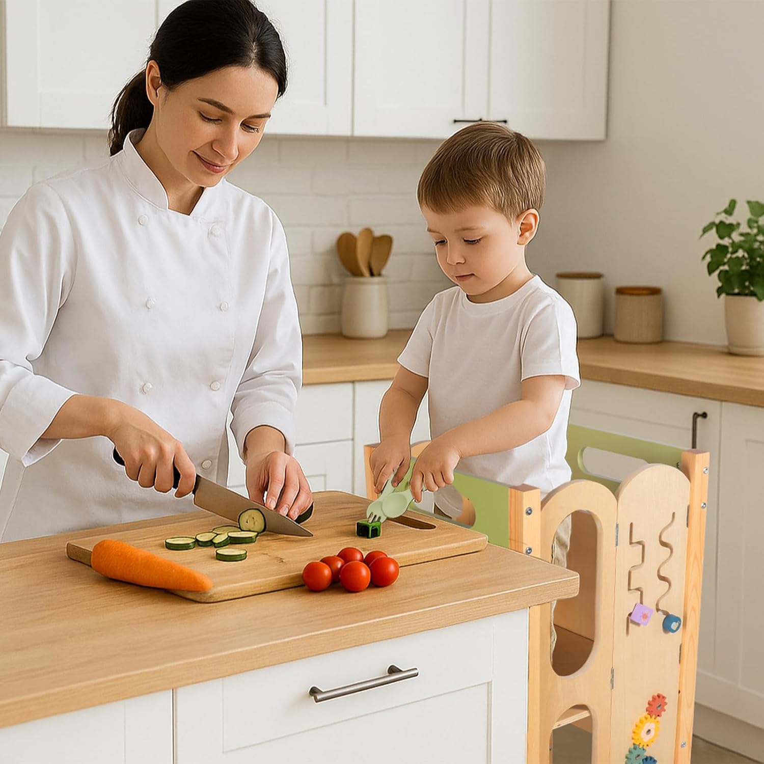 Avec ce tabouret Montessori, chaque moment devient une occasion de grandir. Que ce soit pour grimper au comptoir, se laver les mains ou participer à la préparation des repas, cette tour encourage l’autonomie tout en créant des moments de complicité avec les parents. Les activités éducatives incluses contribuent également au développement de la motricité fine, des capacités cognitives et de la créativité.