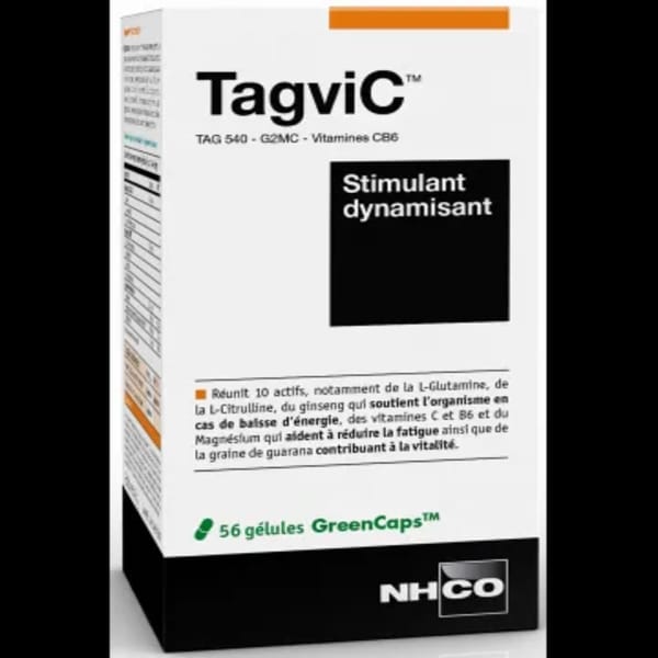 Pour stimuler et dynamiser l’organisme afin de diminuer la fatigue Tagvic est un complément alimentaire des laboratoires NHCO associant des actifs naturels tels que la L-Glutamine, la L-Citrulline, du ginseng, des vitamines C et B6 et du Magnésium ainsi que de la graine de guarana. L’ensemble des actifs synergie des plantes, des acides aminés vitamines et minérauxstimule le métabolisme énergétique apportant un effet dynamisant.