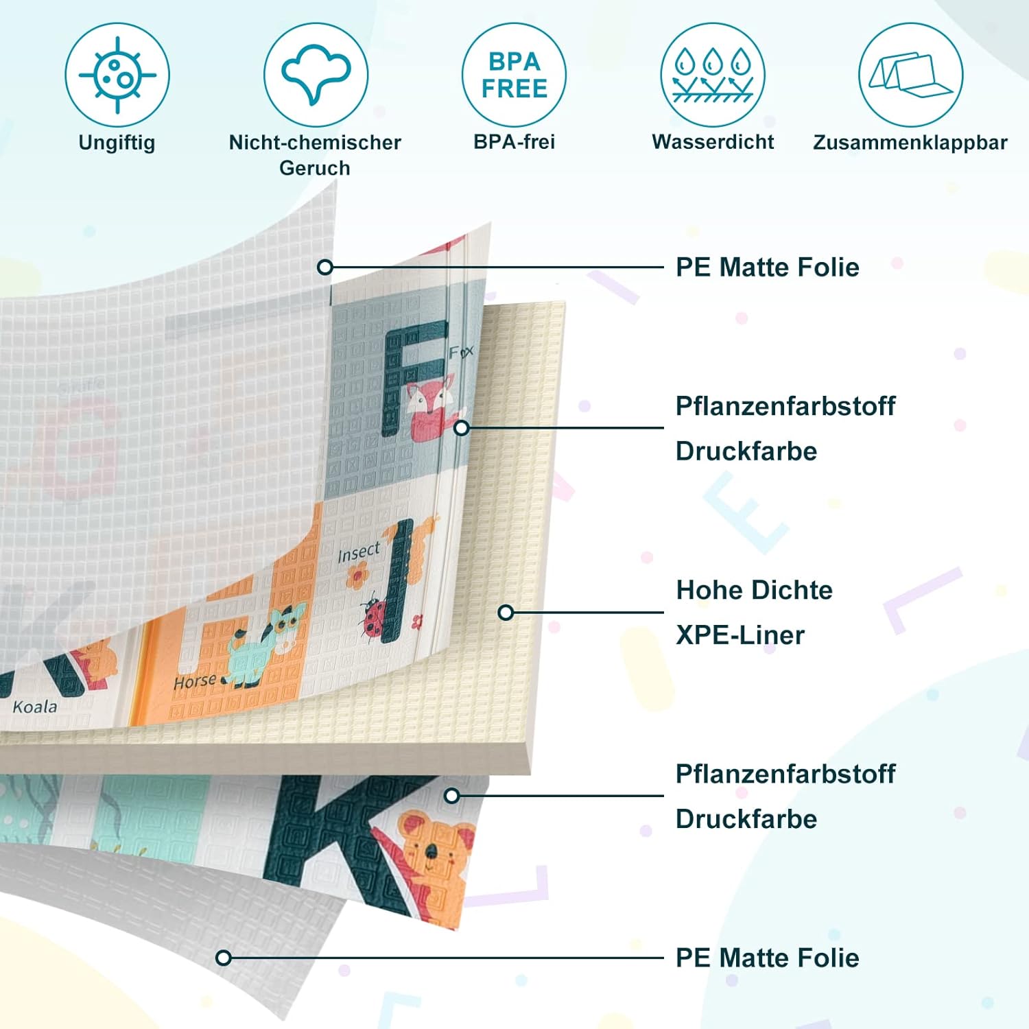 Conformément aux principes Montessori, ce tapis est fabriqué à partir de matériau XPE haute densité sans odeur, exempt de BPA et de substances toxiques. Doux et antibactérien, il offre un environnement sûr, propre et stimulant pour votre enfant. Son motif antidérapant assure une stabilité maximale lors des jeux de bébé, qu’il rampe, roule, s’assoit ou marche.