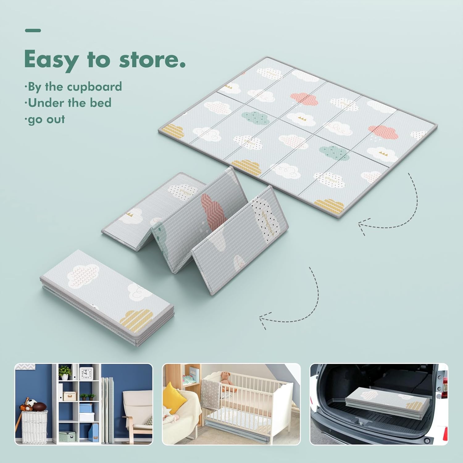 Le tapis d’éveil Montessori Uanlauo se distingue également par sa légèreté et sa flexibilité. Il se plie facilement et peut être rangé à côté des canapés, des placards ou des armoires lorsqu’il n’est pas utilisé, permettant ainsi de préserver l’espace de votre maison.
