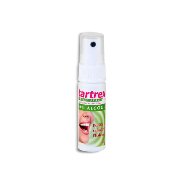 TARTREX FRESH SPRAY AUX HUILES ESSENTIELLES purifie et rafraîchit lhaleine grâce à sa composition en huiles essentielles naturelles (romarin, menthe, cyprès).