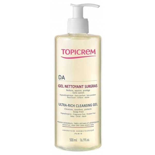 Topicrem Peaux Atopiques DA Gel Nettoyant Surgras 500 ml nettoie, apaise et protège le visage et le corps des peaux sensibles très sèches et atopiques.