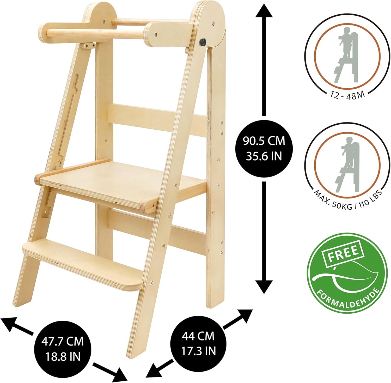 La sécurité de votre enfant est notre priorité. C’est pourquoi nous avons pris soin de tester le matériau en bois utilisé dans la fabrication de cette tour d’apprentissage Montessori. Il a été certifié sans formaldéhyde. De plus, sa capacité maximale de charge atteint les 50 kilogrammes, garantissant ainsi une utilisation sûre même lorsque votre enfant grandit.