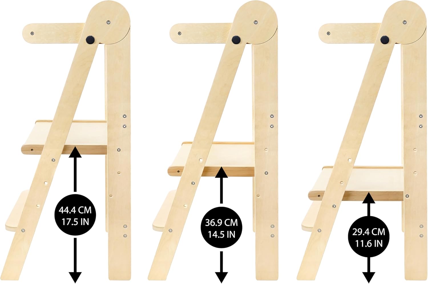 Cette tour d’apprentissage se distingue par sa polyvalence et son caractère ajustable. Grâce à ses 3 réglages de hauteur (29,4 cm, 36,9 cm et 44,4 cm mesurés à partir du sol), vous pouvez l’adapter en fonction de la taille de votre enfant. Que ce soit pour atteindre le lavabo de la salle de bain ou le plan de travail de la cuisine, votre enfant pourra faire ses premiers pas vers l’autonomie en toute sécurité.