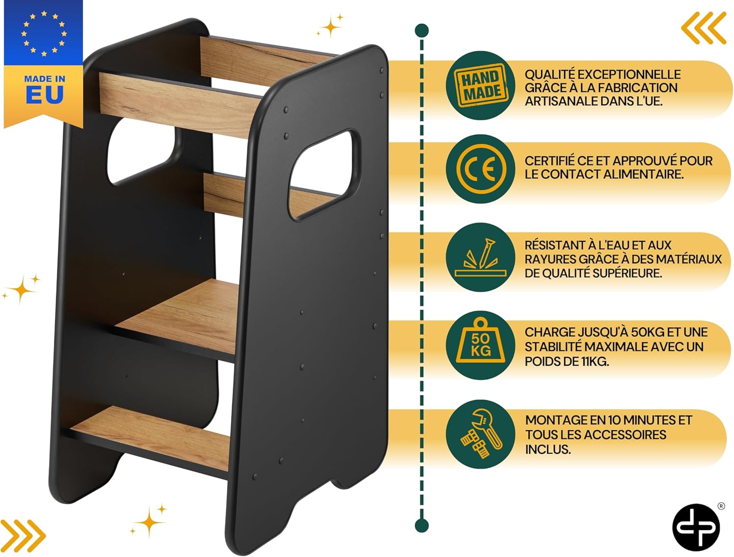 Tabouret de cuisine Montessori pour enfants : tour d’observation avec dossier et découpes variées