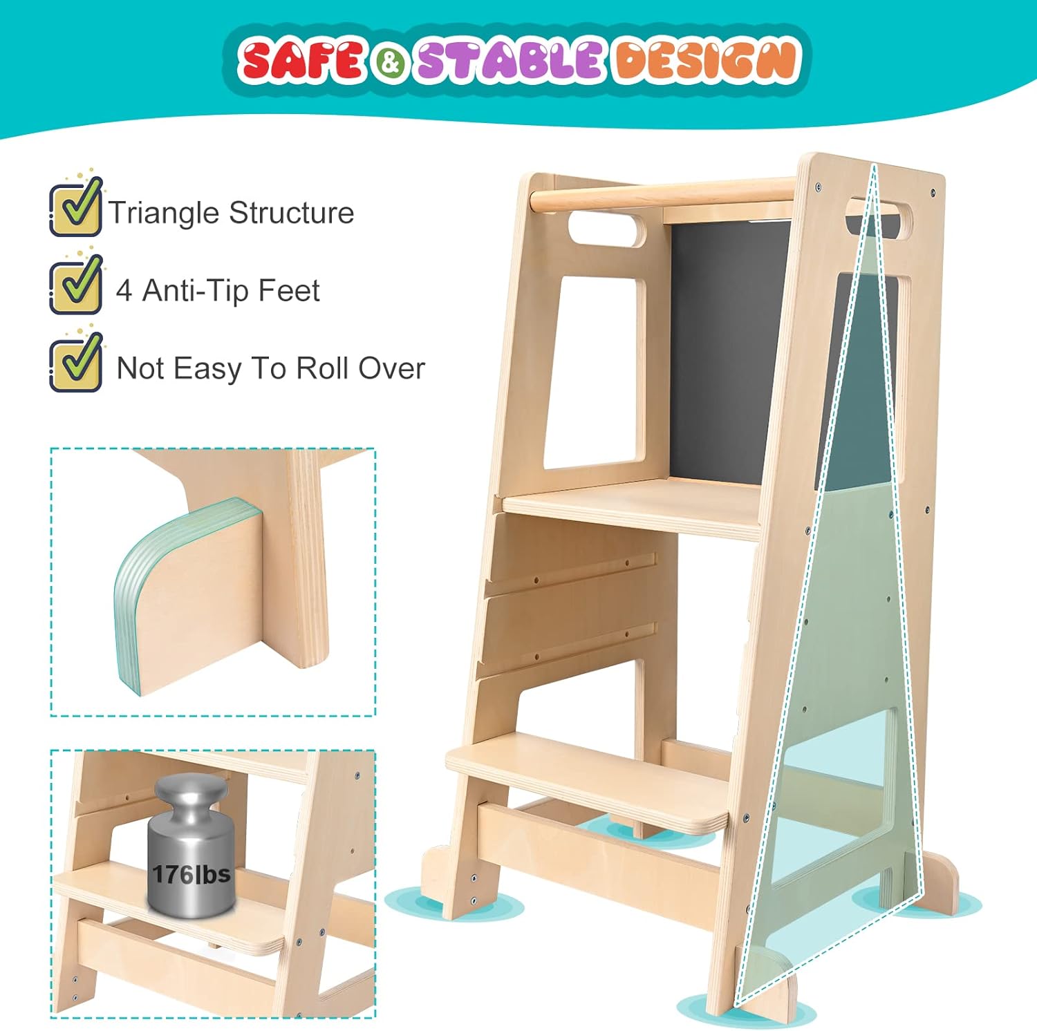 Imaginée pour garantir une sécurité optimale, cette Tour d’apprentissage Montessori se distingue par son design trapézoïdal. Ses quatre pieds anti-basculement en bas offrent une stabilité inégalée, rendant ce meuble résistant aux roulements et autres mouvements brusques. Conçu avec un rail de sécurité, ce mobilier prévient efficacement les chutes, tout en offrant suffisamment d’espace pour se tenir debout. Pour couronner le tout, elle dispose de deux marches facilitant la montée et la descente des enfants, leur assurant une autonomie sécurisée.