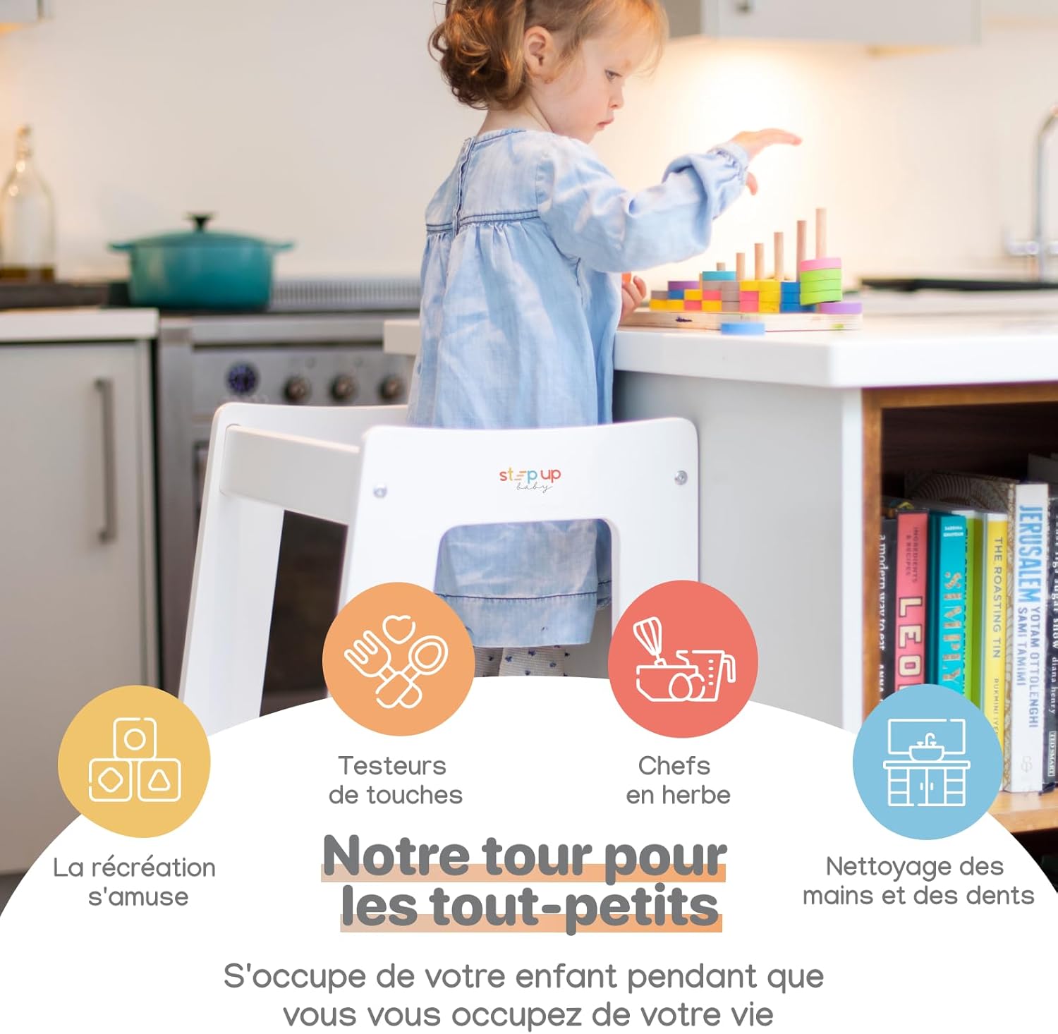 Éveillez l’autonomie et la curiosité de votre enfant avec la Tour d’observation Stepup Baby Montessori. Conçue pour favoriser une participation active et sécurisée aux activités quotidiennes, cette tour d’apprentissage stimule l’éducation autonome et l’intégration de votre enfant dans diverses tâches ménagères. Qu’il s’agisse de cuisine, de lavage ou simplement de se brosser les dents, votre enfant trouvera une multitude d’utilisations à cet outil pédagogique.