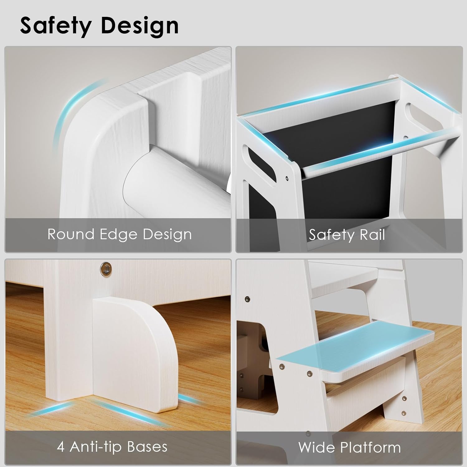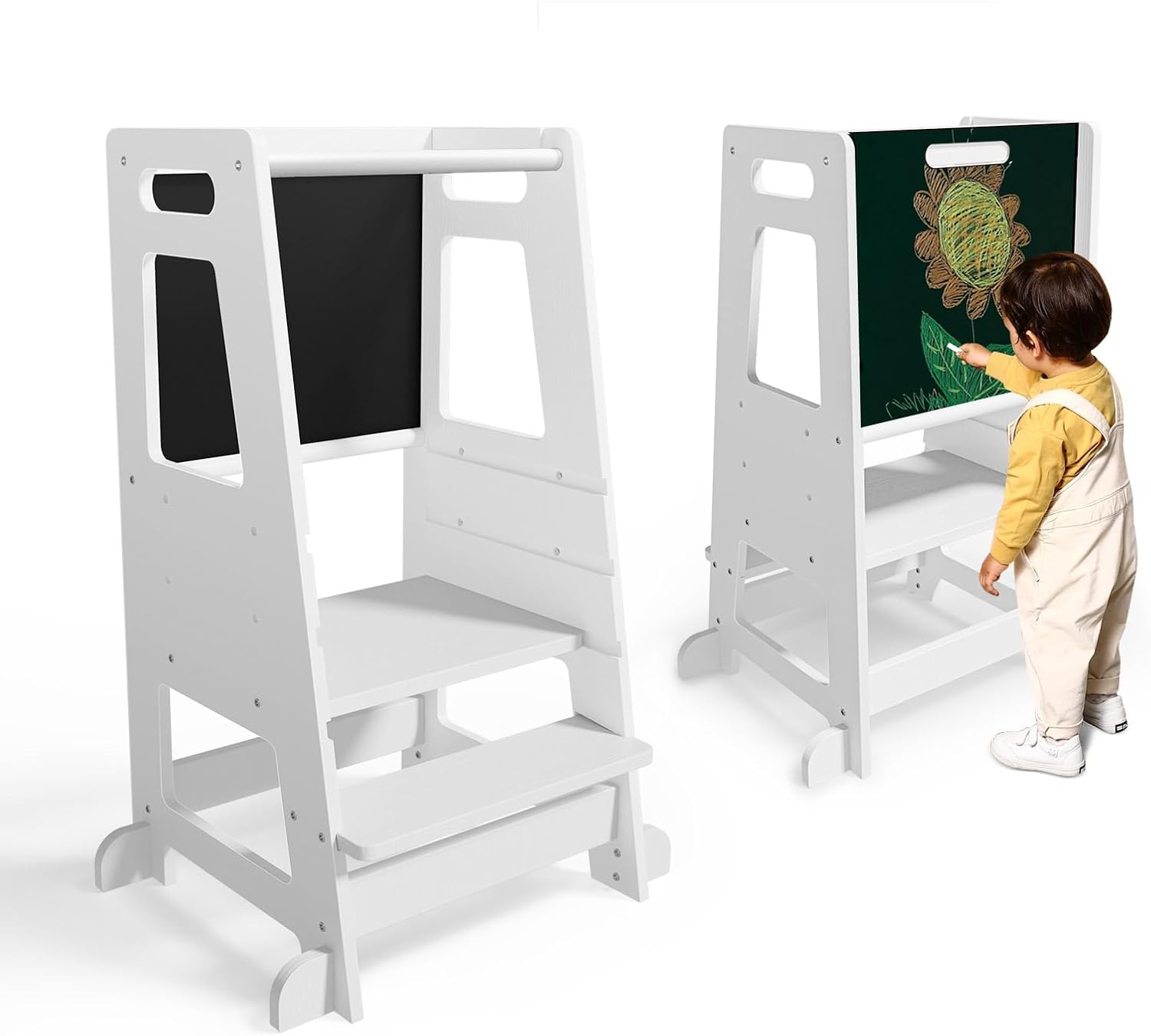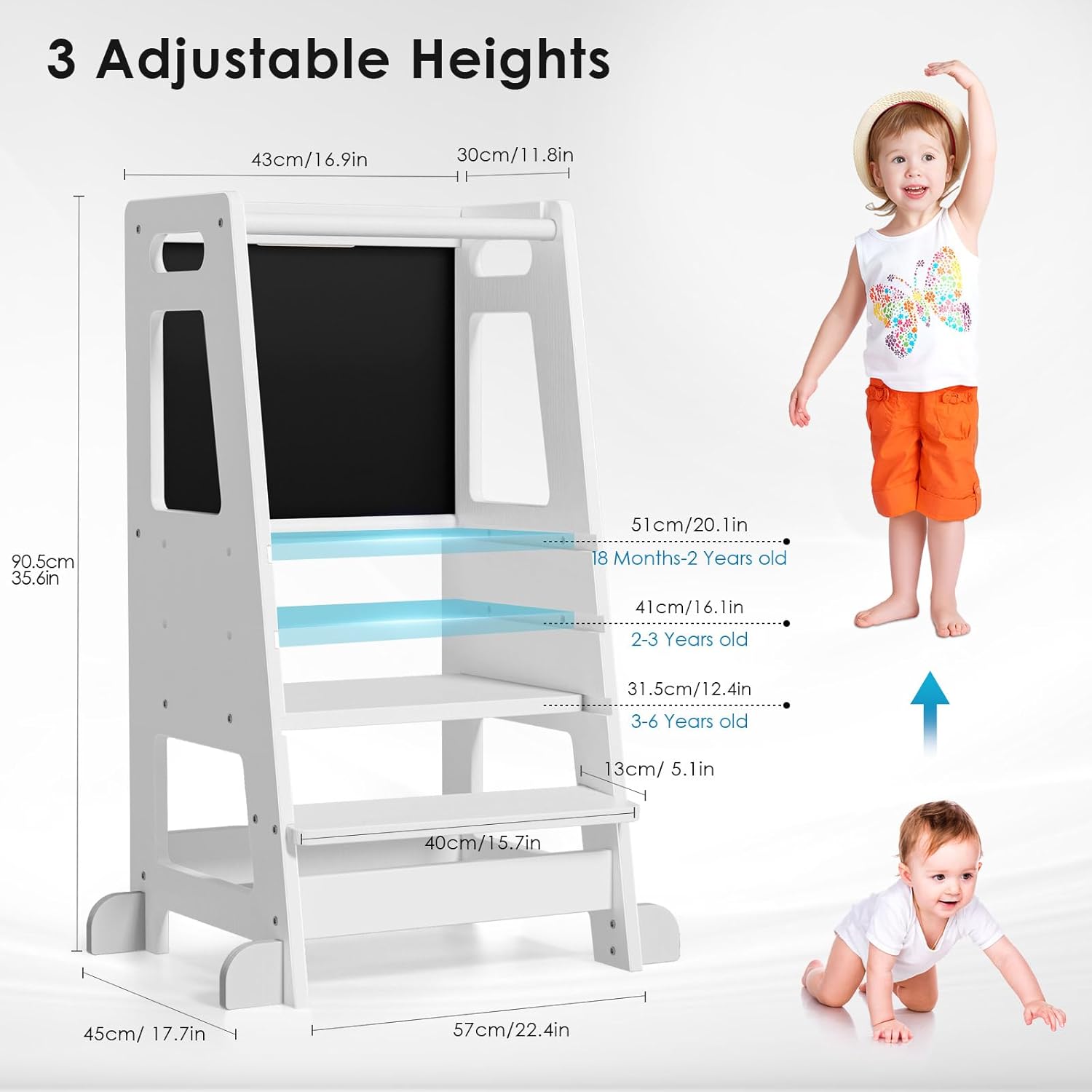 Notre tour d’apprentissage offre une flexibilité sans pareil grâce à ses 3 hauteurs réglables (12,4, 16,1, 20,1 pouces). Elle s’adapte ainsi parfaitement à l’évolution de votre enfant, de 18 mois à 4 ans. Il vous suffit simplement de desserrer les vis, de sélectionner la hauteur désirée et de la fixer en place. En prime, sa plaque de base est amovible et peut être transformée en chaise pour une utilisation polyvalente.