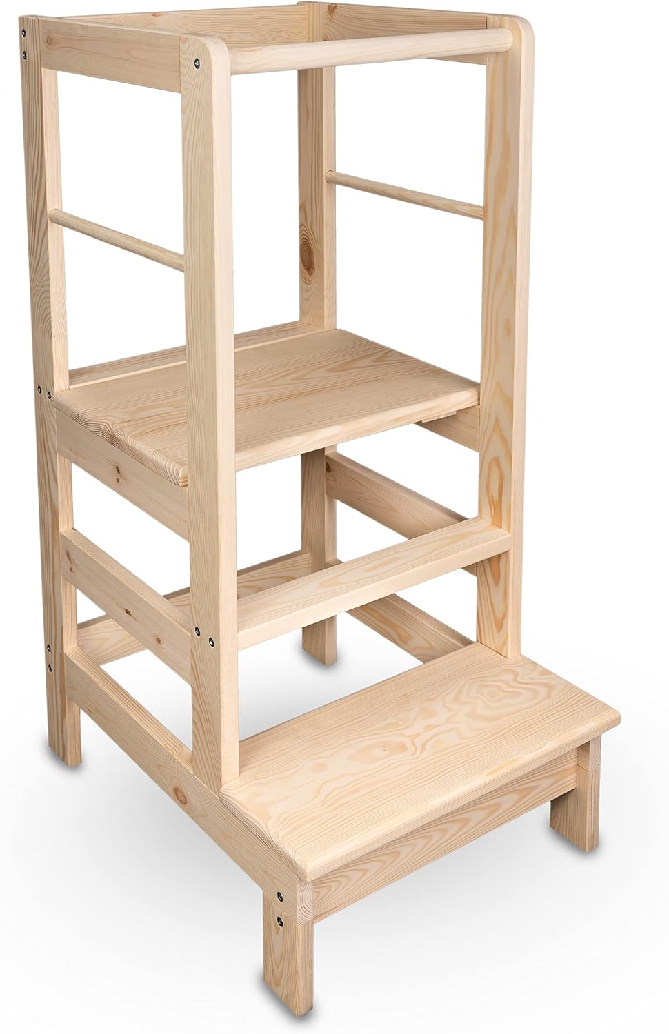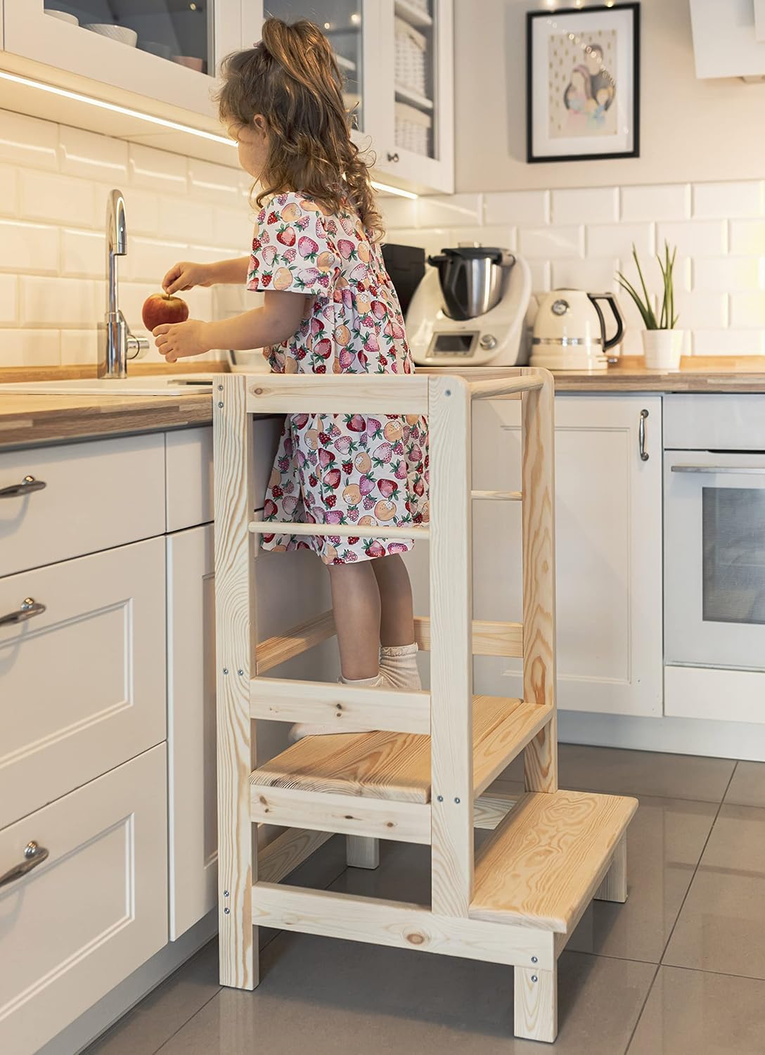 Tabouret de cuisine Montessori pour enfants : tour d’observation avec dossier et découpes variées