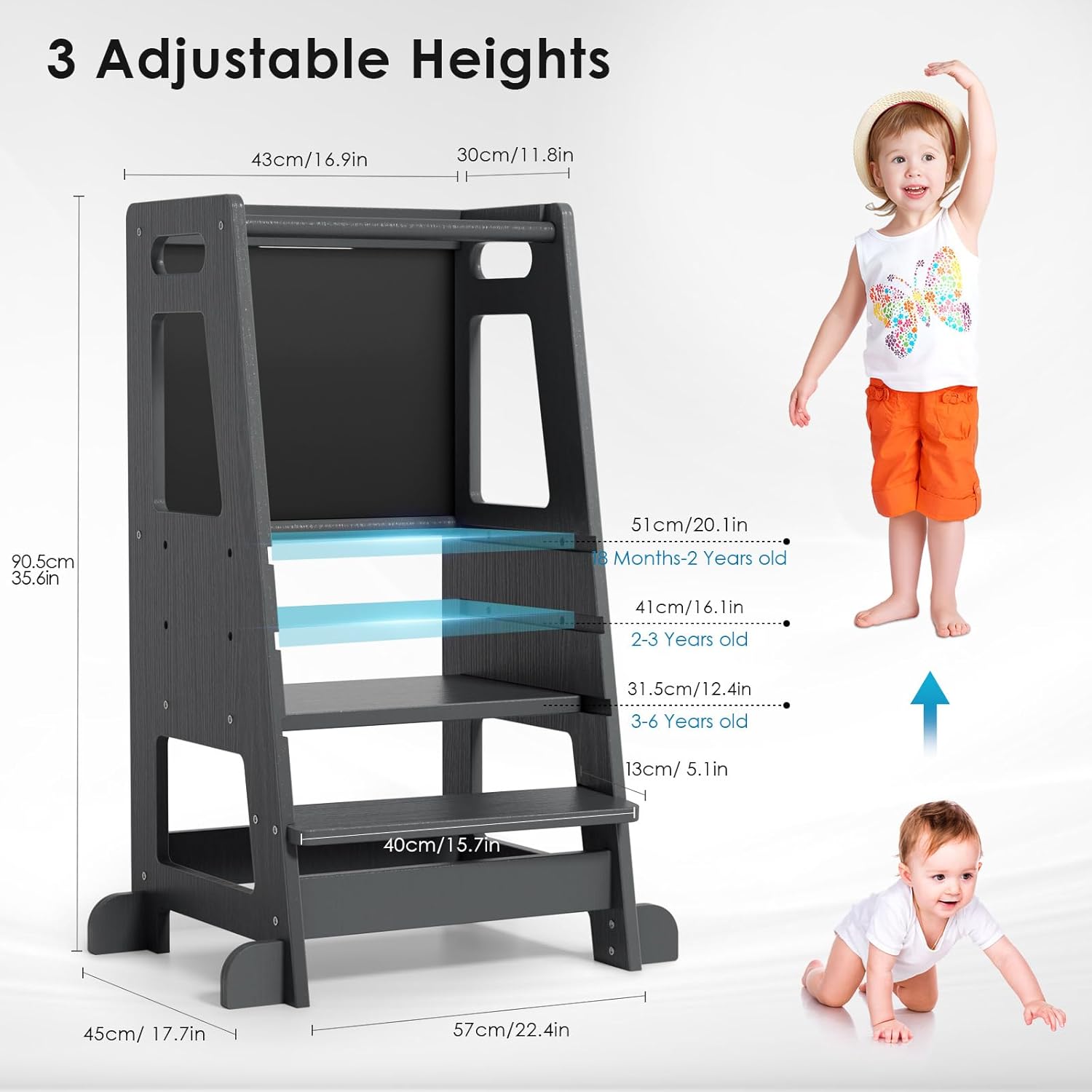 Cette Tour d’Observation est dotée d’une particularité ingénieuse : elle est réglable en 3 hauteurs (12,4, 16,1, 20,1 pouces). Cette flexibilité permet d’adapter l’outil aux enfants âgés de 18 mois à 4 ans. Le réglage se fait aisément en desserrant les vis et en sélectionnant la hauteur souhaitée. Mais ce n’est pas tout ! La plaque de base peut être retirée pour transformer cet outil d’apprentissage en une chaise pratique et stylée.