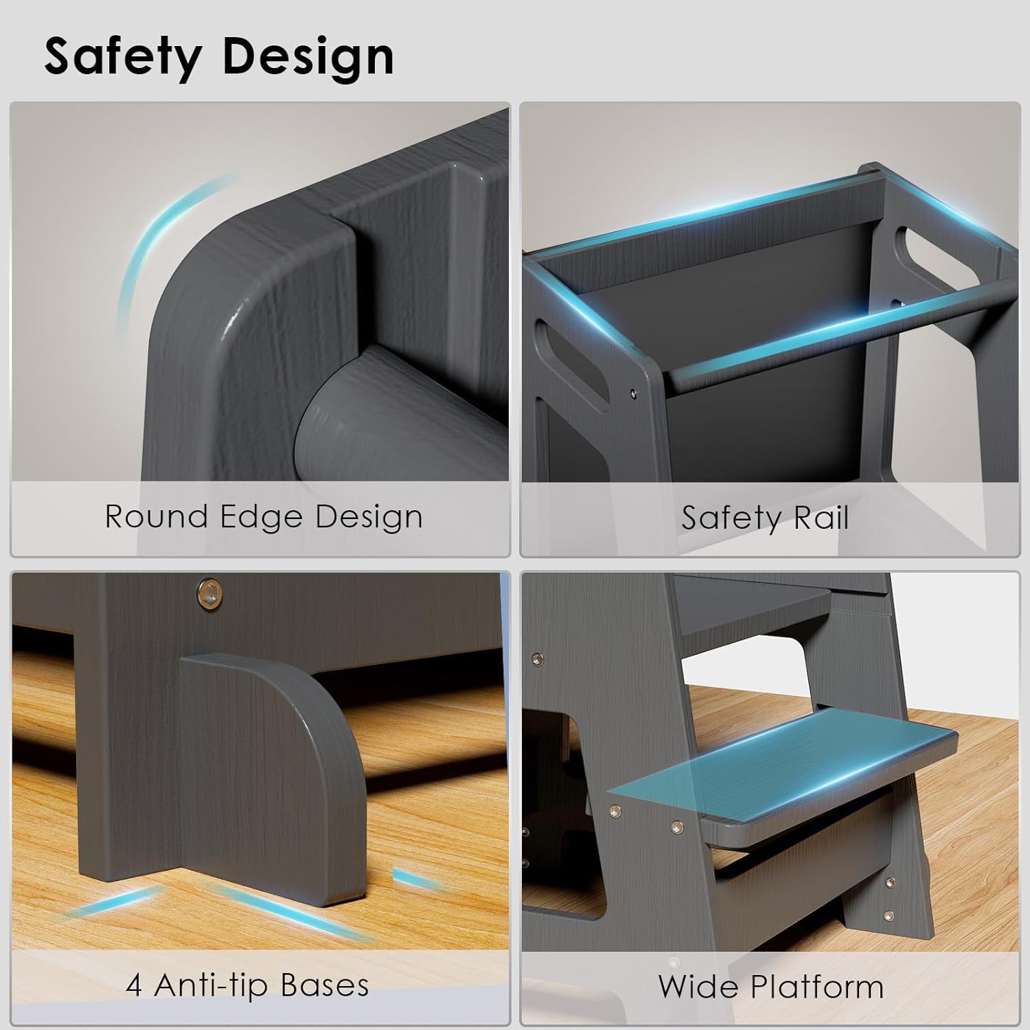 Tabouret de cuisine Montessori pour enfants : tour d’observation avec dossier et découpes variées
