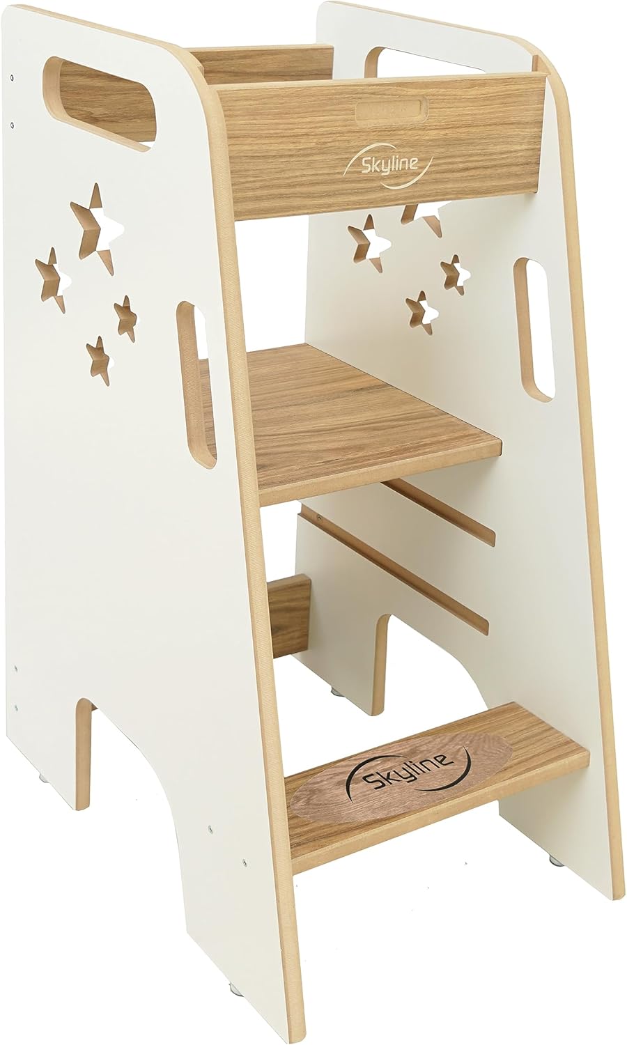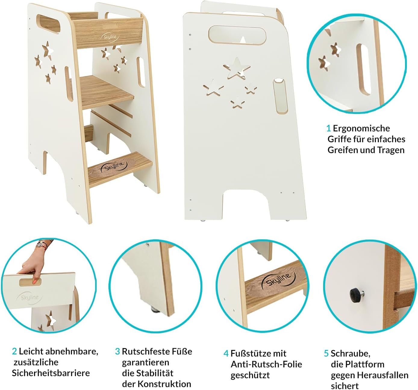 Tabouret de cuisine Montessori pour enfants : tour d’observation avec dossier et découpes variées