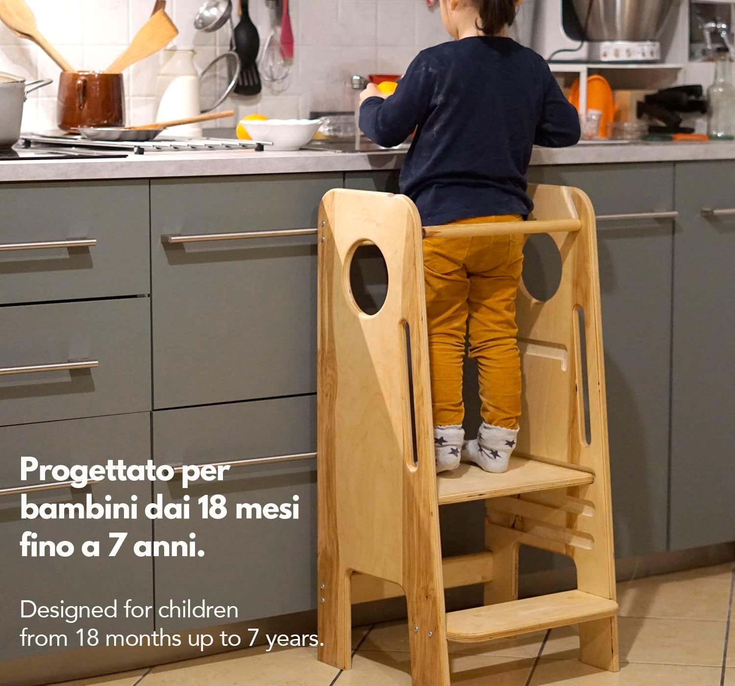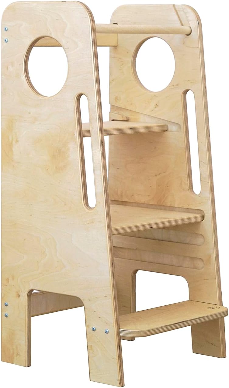 Tabouret de cuisine Montessori pour enfants : tour d’observation avec dossier et découpes variées