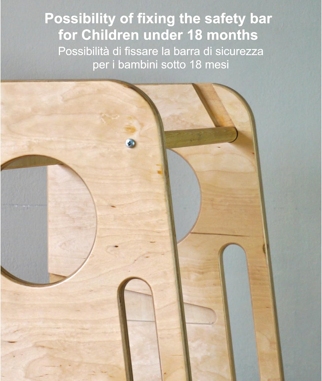 Cette tour Montessori peut être utilisée dès 12 mois, avec une barre fixée par des vis fournies pour garantir une sécurité maximale. Elle peut ensuite être utilisée jusqu’à 7 ans aussi bien comme tour que comme chaise. Après les 24 mois, il est possible de retirer les vis pour permettre une montée et une descente sans contours, encourageant une posture correcte chez l’enfant.