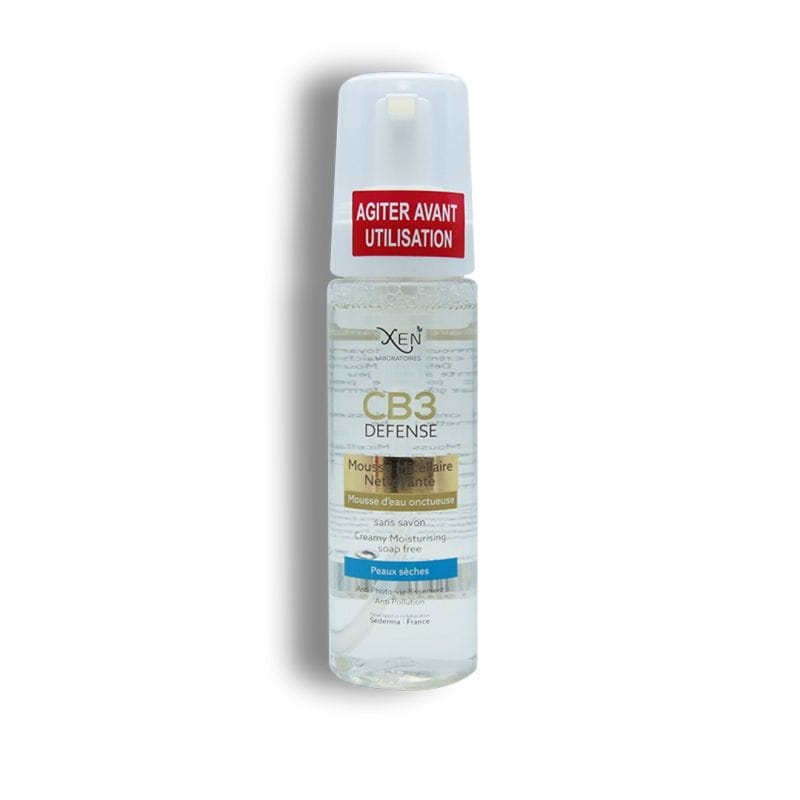 XEN CB3 DEFENSE MOUSSE MICELLAIRE NETTOYANTE PEAUX SECHES 200ML XEN CB3 DEFENSE MOUSSE MICELLAIRE NETTOYANTE PEAUX SECHES est une mousse nettoyante douce pour le nettoyage quotidien du visage et des yeux. Elle remplace le savon traditionnel tout en nettoyant délicatement et efficacement la peau tout en éliminant les impuretés. Elle conviendra particulièrement aux peaux normales à sèches. Elle n’agresse pas la peau et laisse un film protecteur après son rinçage. Votre peau restera douce et souple.